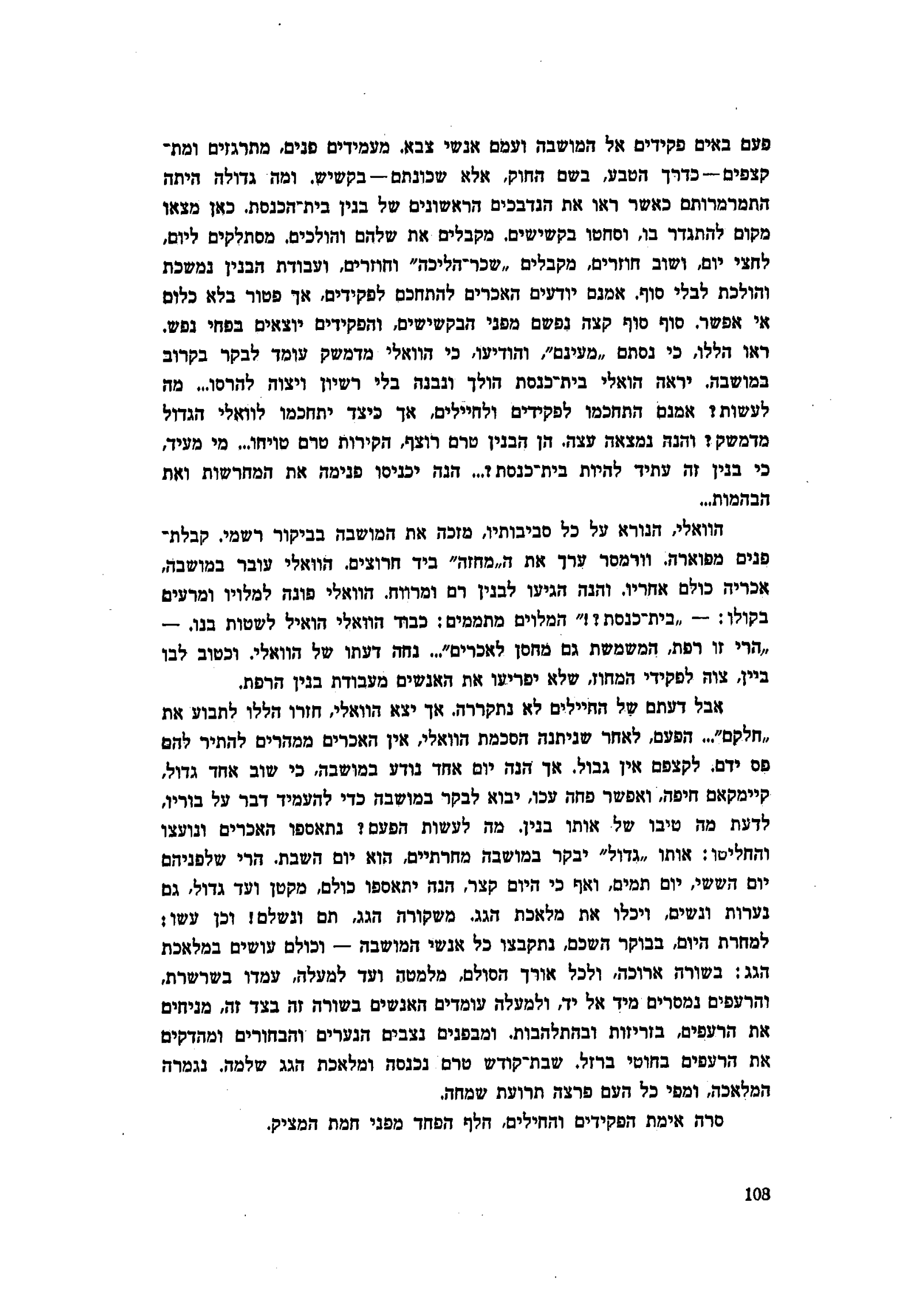 פעם באים פקידים אל המושבה ועמם אנשי צבא. מעמידים פנים, מתרגזים ומתקצפים — כדרך הטבע, בשם החוק, אלא שכונתם — בקשיש. ומה גדולה היתה התמרמרותם כאשר ראו את הנדבכים הראשונים של בנין בית הכנסת. כאן מצאו מקום להתגדר בו, וסחטו בקשישים, מקבלים את שלהם והולכים. מסתלקים ליום, לחצי יום, ושוב חוזרים, מקבלים ״שכר־הליכה״ וחוזרים, ועבודת הבנין נמשכת והולכת לבלי סוף. אמנם יודעים האכרים להתחכם לפקידים, אך פטור בלא כלום אי אפשר. סוף סוף קצה נפשם מפני הבקשישים, והפקידים יוצאים בפחי נפש. ראו הללו, כי נסתם ״מעינם״, והודיעו, כי הוואלי מדמשק עומד לבקר בקרוב במושבה. יראה הואלי בית כנסת הולך ונבנה בלי רשיון ויצוה להרסו... מה לעשות? אמנם התחכמו לפקידים ולחיילים, אך כיצד יתחכמו לוואלי הגדול מדמשק? והנה נמצאה עצה. הן הבנין טרם רוצף, הקירות טרם טויחו... מי מעיד, כי בנין זה עתיד להיות בית־כנסת?... הנה יכניסו פנימה את המחרשות ואת הבהמות…