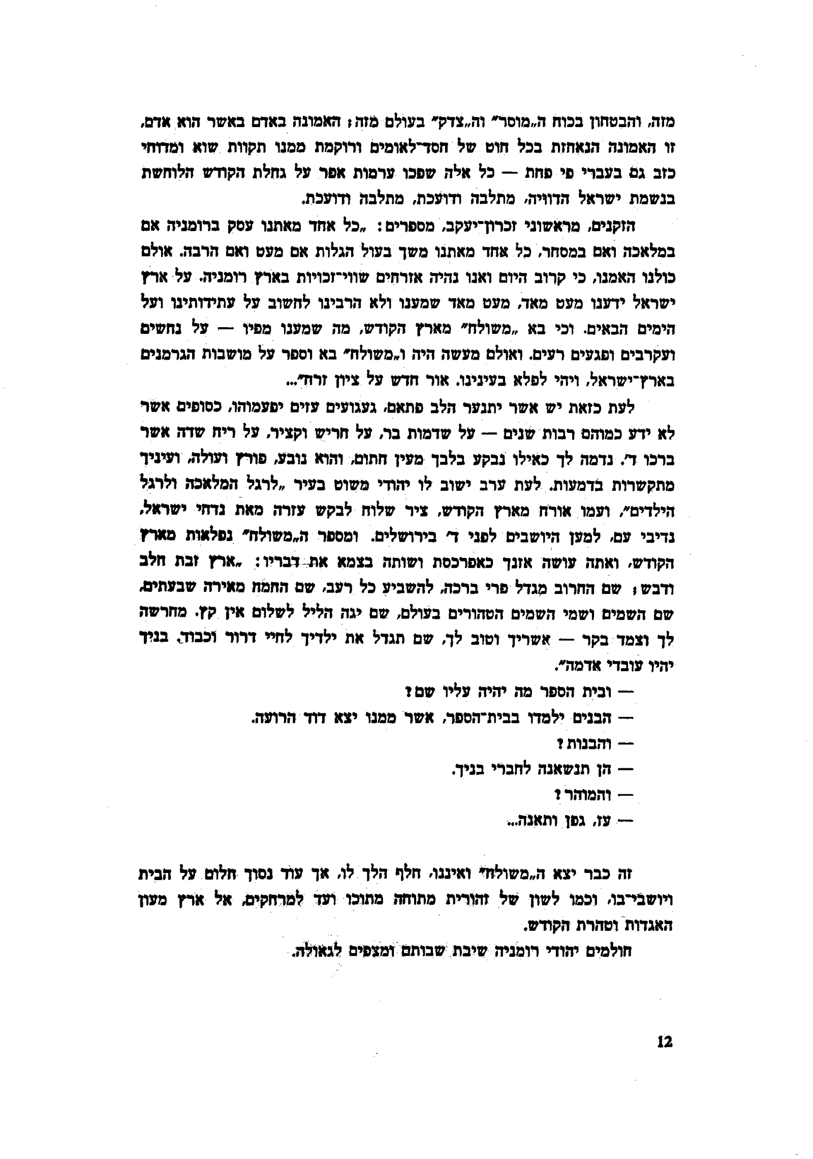בירושלים. ומספר ה״משולח״ נפלאות מארץ הקודש, ואתה עושה אזנך כאפרכסת ושותה בצמא את דבריו: ארץ זבת חלב ודבש; שם החרוב מגדל פרי ברכה, להשביע כל רעב, שם החמה מאירה שבעתים, שם השמים ושמי השמים הטהורים בעולם, שם יגה הליל לשלום אין קץ. מחרשה לך וצמד בקר — אשריך וטוב לך, שם תגדל את ילדיך לחיי דרור וכבוד, בניך יהיו עובדי אדמה״.