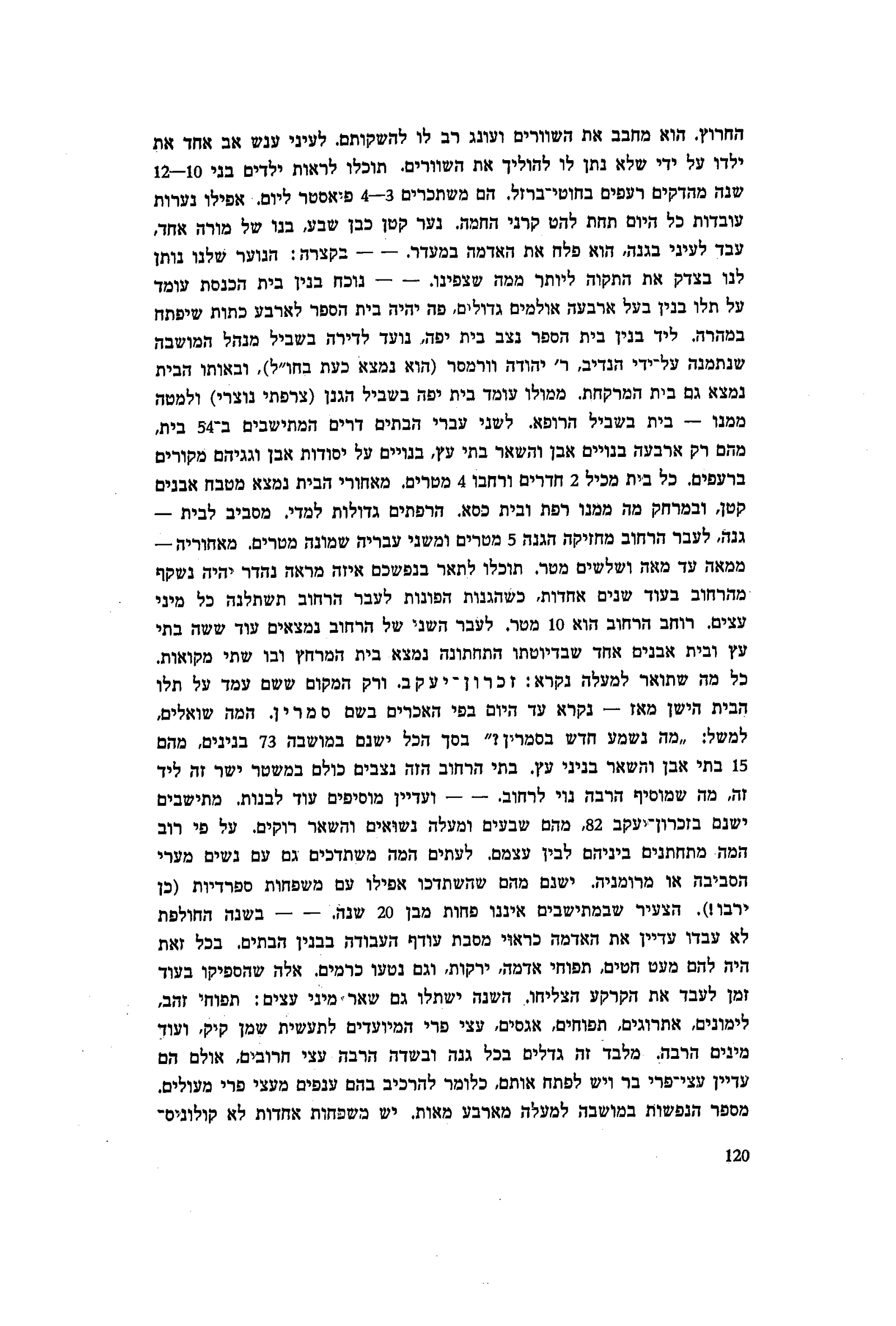 החרוץ. הוא מחבב את השוורים ועונג רב לו להשקותם. לעיני ענש אב אחד את ילדו על ידי שלא נתן לו להוליך את השוורים. תוכלו לראות ילדים בני 10-12 מהדקים רעפים בחוטי ברזל. הם משתכרים 3-4 פיאסטר ליום. אפילו נערות עובדות כל היום תחת להט קרני החמה. נער קטן כבן שבע, בנו של מורה אחד, עבד לעיני בגנה, הוא פלח את האדמה במעדר. — — בקצרה: הנוער שלנו נותן לנו בצדק את התקוה ליותר ממה שציפינו. — — נוכח בנין בית הכנסת עומד על תלו בנין בעל ארבעה אולמים גדולים, פה יהיה בית הספר לארבע כתות שיפתח במהרה. ליד בנין בית הספר נצב בית יפה, נועד לדירה בשביל מנהל המושבה שנתמנה על־ידי הנדיב, ר׳ יהודה וורמסר (הוא נמצא כעת בחו״ל), ובאותו הבית נמצא גם בית המרקחת. ממולו עומד בית יפה בשביל הגנן (צרפתי נוצרי) ולמטה ממנו - - בית בשביל הרופא. לשני עברי הבתים דרים המתישבים ב־54 בית מהם רק ארבעה בנויים אבן והשאר בתי עץ, בנויים על יסודות אבן וגגיהם מקורים ברעפים. כל בית מכיל 2 חדרים ורחבו 4 מטרים. מאחורי הבית נמצא מטבח אבנים קטן, ובמרחק מה ממנו רפת ובית כסא, הרפתים גדולות למדי. מסביב לבית — גנה, לעבר הרחוב מחזיקה הגנה 5 מטרים ומשני עבריה שמונה מטרים. מאחוריה — ממאה עד מאה ושלשים מטר. תוכלו לתאר בנפשכם איזה מראה נהדר יהיה נשקף מהרחוב בעוד שנים אחדות, כשהגנות הפונות לעבר הרחוב תשתלנה כל מיני עצים. רוחב הרחוב הוא 10 מטר, לעבר השני של הרחוב נמצאים עוד ששה בתי עץ ובית אבנים אחד שבדיוטתו התחתונה נמצא בית המרחץ ובו שתי מקואות. כל מה שתואר למעלה נקרא: