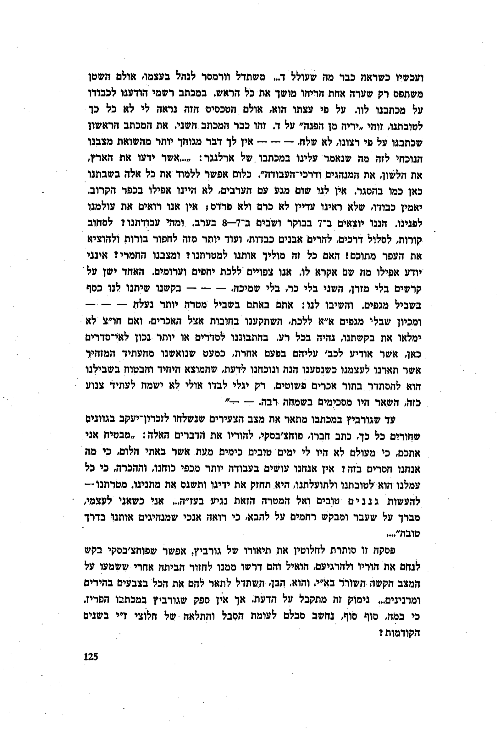 ועכשיו, כשראה כבר מה שעולל ד... משתדל וורמסר לנהל בעצמו, אולם השטן משתפס רק שערה אחת הריהו מושך את כל הראש. במכתב רשמי הודענו לכבודו על מכתבנו לוו. על פי עצתו הוא, אולם הטכסיס הזה נראה לי לא כל כך לטובתנו, זוהי ״יריה מן הפנה״ על ד. זהו כבר המכתב השני. את המכתב הראשון שכתבנו על פי רצונו, לא שלח. — — — אין לך דבר מגוחך יותר מהשואת מצבנו הנוכחי לזה מה שנאמר עלינו במכתבו של ארלנגר: ״...אשר ידעו את הארץ, את הלשון, את המנהגים ודרכי העבודה״. כלום אפשר ללמוד את כל אלה בשבתנו כאן כמו בהסגר. אין לנו שום מגע עם הערבים, לא היינו אפילו בכפר הקרוב. יאמין כבודו, שלא ראינו עדיין לא כרם ולא פרדס; אין אנו רואים את עולמנו לפנינו. הננו יוצאים ב־7 בבוקר ושבים ב־8-7 בערב. ומהי עבודתנו? לסחוב קורות, לסלול דרכים, להרים אבנים כבדות, ועוד יותר מזה לחפור בורות ולהוציא את העפר מתוכם! האם כל זה מוליך אותנו למטרתנו? ומצבנו החמרי? אינני יודע אפילו מה שם אקרא לו. אנו צפויים ללכת יחפים וערומים. האחד ישן על קרשים בלי מזרן, השני בלי כר, בלי שמיכה. — — — בקשנו שיתנו לנו כסף בשביל מגפים, והשיבו לנו: אתם באתם בשביל מטרה יותר נעלה — — — ומכיון שבלי מגפים