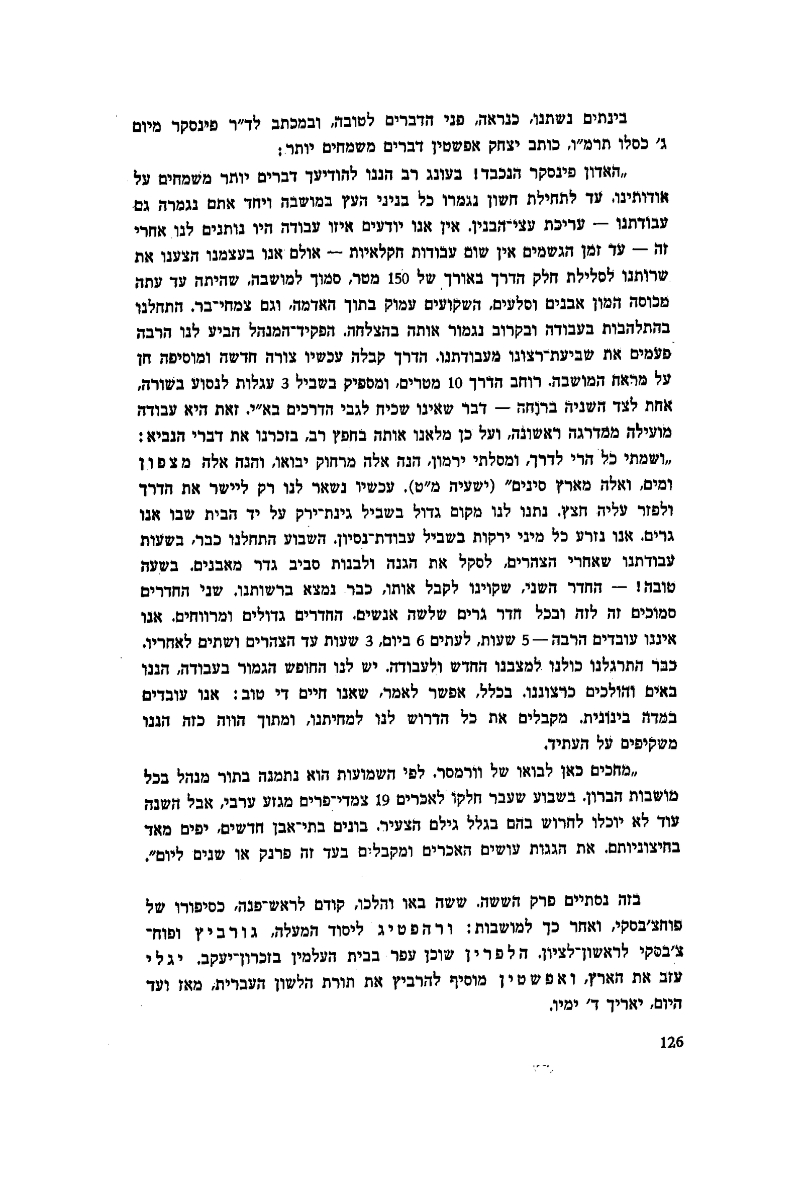 ״האדון פינסקר הנכבד! בעונג רב הננו להודיעך דברים יותר משמחים על אודותינו. עד לתחילת חשון נגמרו כל בניני העץ במושבה ויחד אתם נגמרה גם עבודתנו — עריכת עצי־הבנין. אין אנו יודעים איזו עבודה היו נותנים לנו אחרי זה — עד זמן הגשמים אין שום עבודות חקלאיות — אולם אנו בעצמנו הצענו את שרותנו לסלילת חלק הדרך באורך 150 מטר, סמוך למושבה, שהיתה עד עתה מכוסה המון אבנים וסלעים, השקועים עמוק בתוך האדמה, וגם צמחי־בר. התחלנו בהתלהבות בעבודה ובקרוב נגמור אותה בהצלחה. הפקיד־המנהל הביע לנו הרבה פעמים את שביעות־רצונו מעבודתנו. הדרך קבלה עכשיו צורה חדשה ומוסיפה חן על מראה המושבה. רוחב הדרך 10 מטרים, ומספיק בשביל 3 עגלות לנסוע בשורה אחת לצד השניה ברוחה — דבר שאינו שכיח לגבי הדרכים בא״י. זאת היא עבודה מועילה ממדרגה ראשונה, ועל כן מלאנו אותה בחפץ רב, בזכרנו את דברי הנביא: ״ושמתי כל הרי דרך, ומסלתי ירמון, הנה אלה מרחוק יבואו, והנה אלה