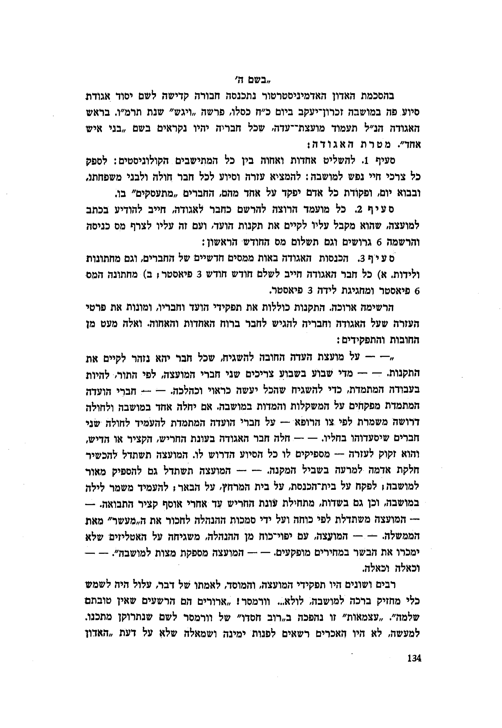 סעיף 1. להשליט אחדות ואחוה בין כל המתישבים הקולוניסטים: לספק כל צרכי חיי נפש למושבה: להמציא עזרה וסיוע לכל חבר חולה ולבני משפחתו ובבוא יום, ופקודת כל אדם יפקד על אחד מהם, החברים "מתעסקים״ בו.