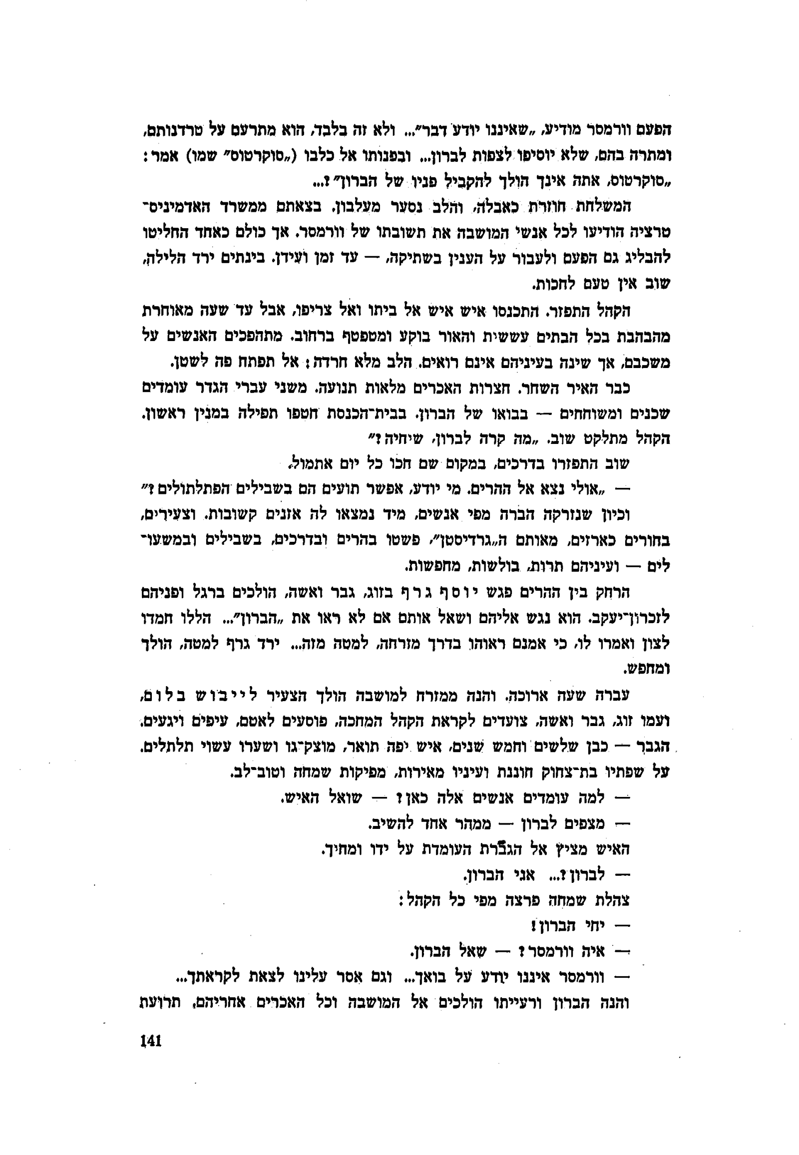 כבר האיר השחר. חצרות האכרים מלאות תנועה. משני עברי הגדר עומדים שכנים ומשוחחים – בבואו של הברון. בבית הכנסת חטפו תפילה במנין ראשון. הקהל מתלקט שוב. ״מה קרה לברון, שיחיה?״