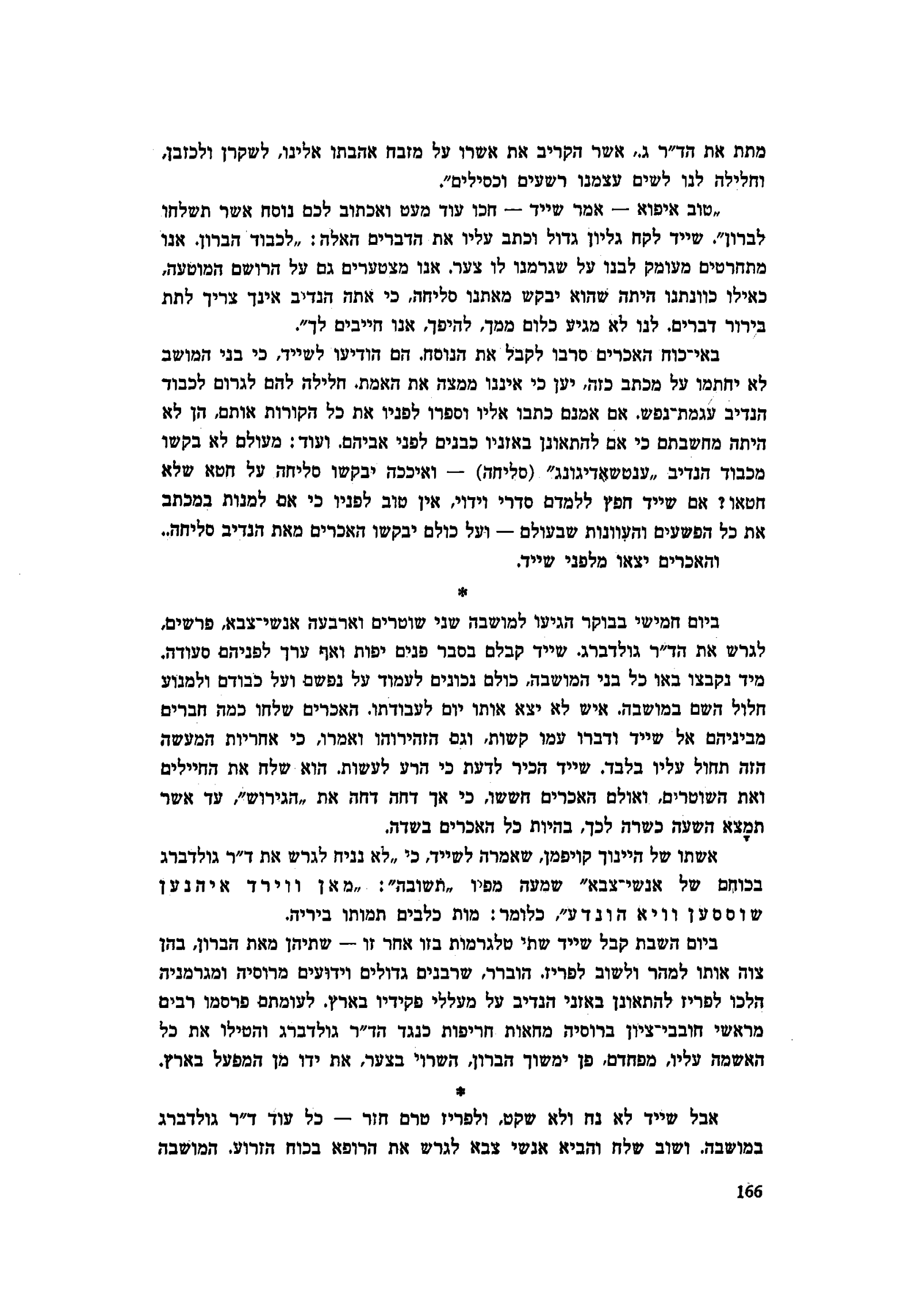 ״טוב איפוא — אמר שייד – חכו עוד מעט ואכתוב לכם נוסח אשר תשלחו לברון״. שייד לקח גליון גדול וכתב עליו את הדברים האלה: ״לכבוד הברון. אנו מתחרטים מעומק לבנו על שגרמנו לו צער. אנו מצטערים גם על הרושם המוטעה כאילו כוונתנו היתה שהוא יבקש מאתנו סליחה, כי אתה הנדיב אינך צריך לתת בירור דברים. לנו לא מגיע כלום ממך, להיפך, אנו חייבים לך״.