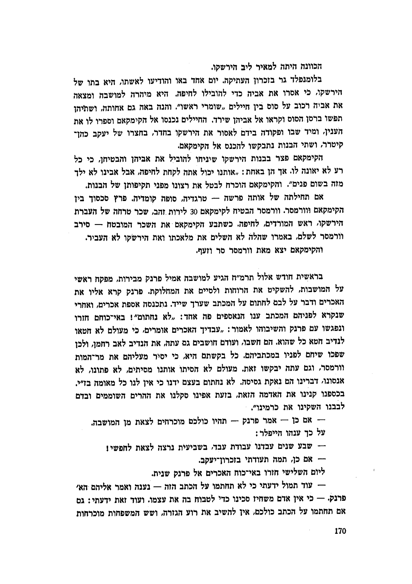 פרנק. — כי אין אדם משחיז סכינו כדי לטבוח בה את עצמו. ועוד זאת ידעתי: גם אם תחתמו על הכתב כולכם, אין להשיב את רוע הגזרה, ושש המשפחות מוכרחות