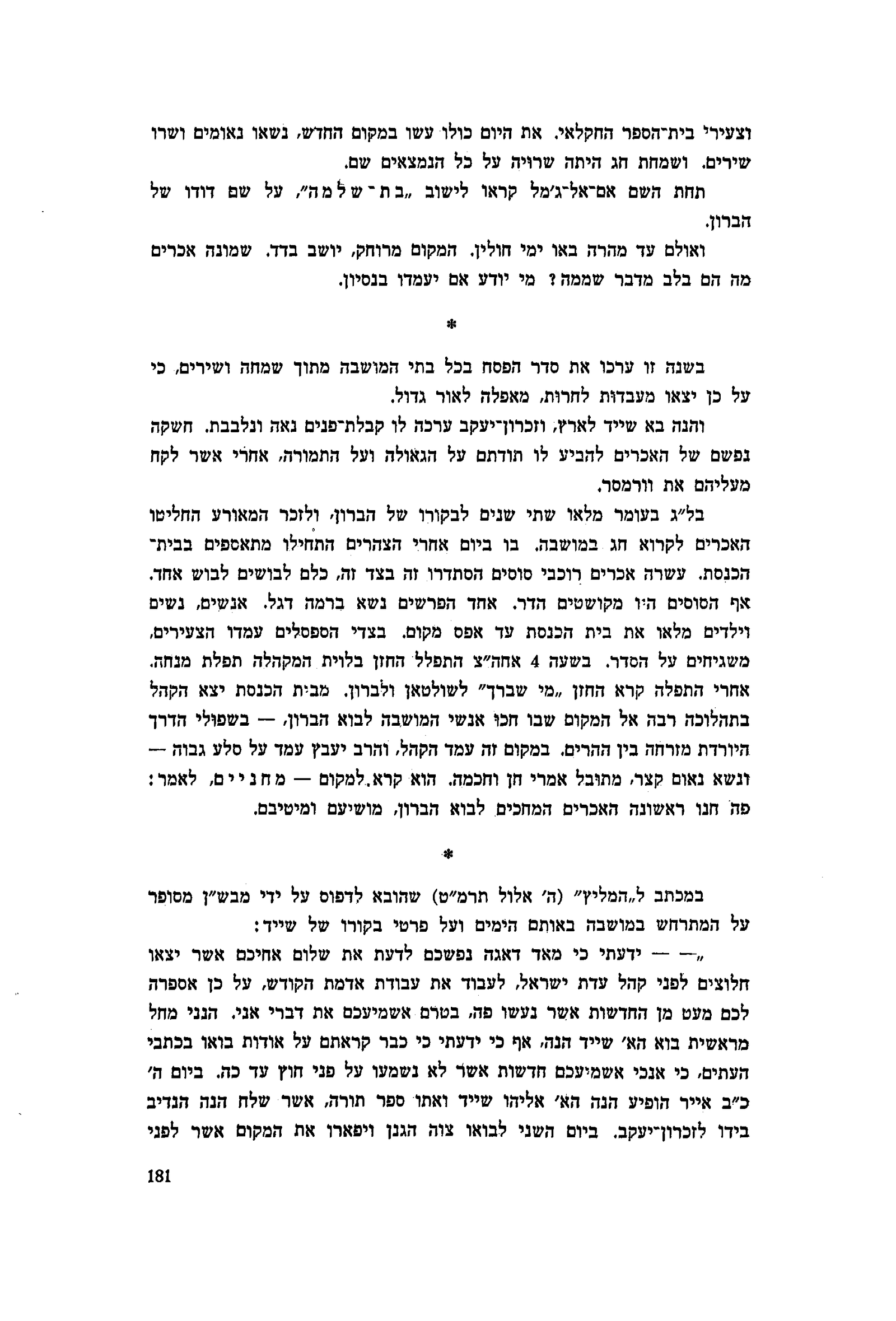 בל״ג בעומר מלאו שתי שנים לבקורו של הברון, ולזכר המאורע החליטו האכרים לקרוא חג במושבה. בו ביום אחרי הצהרים התחילו מתאספים בבית־הכנסת. עשרה אכרים רוכבי סוסים הסתדרו זה בצד זה, כלם לבושים לבוש אחד. אף הסוסים היו מקושטים הדר. אחד הפרשים נשא ברמה דגל. אנשים, נשים וילדים מלאו את בית הכנסת עד אפס מקום. בצדי הספסלים עמדו הצעירים, משגיחים על הסדר. בשעה 4 אחה״צ התפלל החזן בלוית המקהלה תפלת מנחה. אחרי התפלה קרא החזן ״מי שברך״ לשולטאן ולברון. מבית הכנסת יצא הקהל בתהלוכה רבה אל המקום שבו חכו אנשי המושבה לבוא הברון, — בשפולי הדרך היורדת מזרחה בין ההרים. במקום זה עמד הקהל, והרב יעבץ עמד על סלע גבוה — ונשא נאום קצר, מתובל אמרי חן וחכמה. הוא קרא למקום –