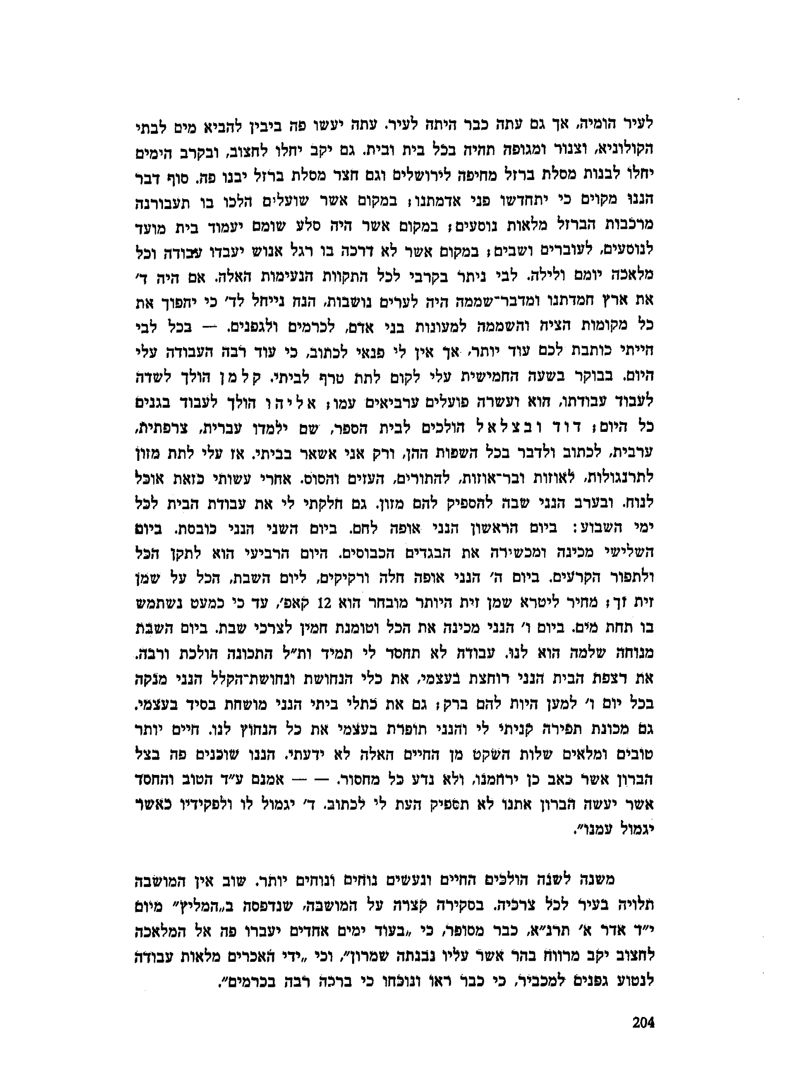 את ארץ חמדתנו ומדבר־שממה היה לערים נושבות, הנה נייחל לד׳ כי יהפוך את כל מקומות הציה והשממה למעונות בני אדם, לכרמים ולגפנים. — בכל לבי הייתי כותבת לכם עוד יותר, אך אין לי פנאי לכתוב, כי עוד רבה העבודה עלי היום. בבוקר בשעה החמישית עלי לקום לתת טרף לביתי.