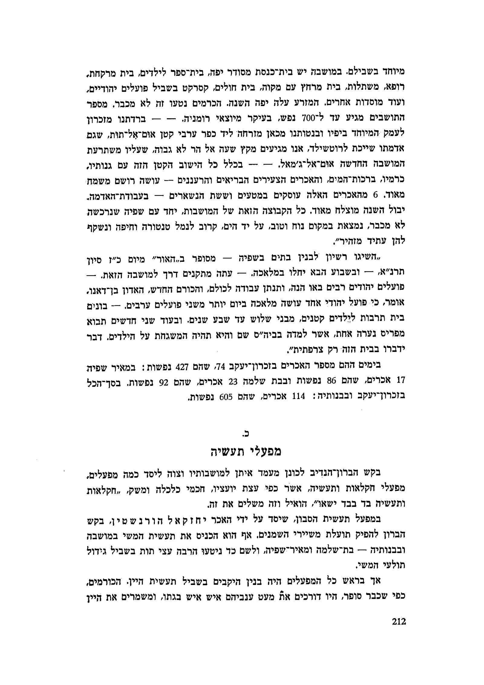 מיוחד בשבילם. במושבה יש בית־כנסת מסודר יפה, בית־ספר לילדים, בית מרקחת, רופא, משתלות, בית מרחץ עם מקוה, בית חולים, קסרקט בשביל פועלים יהודיים, ועוד מוסדות אחרים. המזרע עלה יפה השנה. הכרמים נטעו זה לא מכבר. מספר התושבים מגיע עד ל-700 נפש, בעיקר מיוצאי רומניה. — — ברדתנו מזכרון לעמק המיוחד ביפיו ובנטותנו מכאן מזרחה ליד כפר ערבי קטן אום־אל־תות, שגם אדמתו שייכת לרוטשילד, אנו מגיעים מקץ שעה אל הר לא גבוה, שעליו משתרעת המושבה החדשה אום־אל־ג׳מאל. – – בכלל כל הישוב הקטן הזה עם גנותיו, כרמיו, ברכות־המים, והאכרים הצעירים הבריאים והרעננים — עושה רושם משמח מאוד. 6 מהאכרים האלה עוסקים במטעים וששת הנשארים — בעבודת־האדמה. יבול השנה מוצלח מאוד. כל הקבוצה הזאת של המושבות, יחד עם שפיה שנרכשה לא מכבר, נמצאת במקום נוח וטוב, על יד הים, קרוב לנמל טנטורה וחיפה ונשקף להן עתיד מזהיר״.