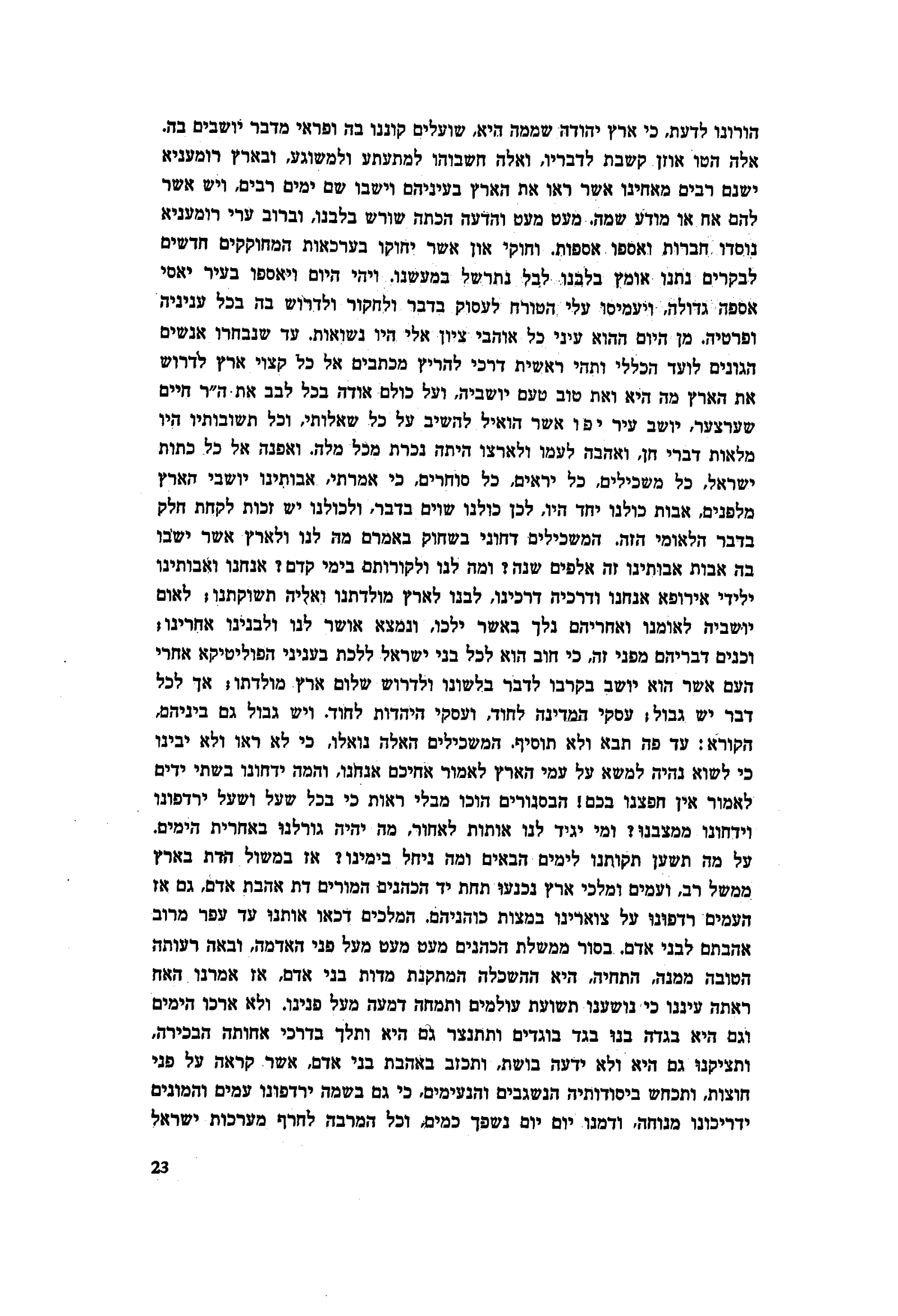 הורונו לדעת, כי ארץ יהודה שממה היא, שועלים קוננו בה ופראי מדבר יושבים בה. אלה הטו אוזן קשבת לדבריו, ואלה חשבוהו למתעתע ולמשוגע, ובארץ רומעניא ישנם רבים מאחינו אשר ראו את הארץ בעיניהם וישבו שם ימים רבים, ויש אשר להם אח או מודע שמה. מעט מעט והדעה הכתה שורש בלבנו, וברוב ערי רומעניא נוסדו חברות ואספו אספות. וחוקי און אשר יחוקו בערכאות המחוקקים חדשים לבקרים נתנו אומץ בלבנו לבל נתרשל במעשנו. ויהי היום ויאספו בעיר יאסי אספה גדולה, ויעמיסו עלי הטורח לעסוק בדבר ולחקור ולדרוש בה בכל עניניה ופרטיה. מן היום ההוא עיני כל אוהבי ציון אלי היו נשואות. עד שנבחרו אנשים הגונים לועד הכללי ותהי ראשית דרכי להריץ מכתבים אל כל קצוי ארץ לדרוש את הארץ מה היא ואת טוב טעם יושביה, ועל כולם אודה בכל לבב את ה״ר חיים שערצער, יושב עיר יפו אשר הואיל להשיב על כל שאלותי, וכל תשובותיו היו מלאות דברי חן, ואהבה לעמו ולארצו היתה נכרת מכל מלה. ואפנה אל כל כתות ישראל, כל משכילים, כל יראים, כל סוחרים, כי אמרתי, אבותינו יושבי הארץ מלפנים, אבות כולנו יחד היו, לכן כולנו שוים בדבר, ולכולנו יש זכות לקחת חלק בדבר הלאומי הזה. המשכילים דחוני בשחוק באמרם מה לנו ולארץ אשר ישבו בה אבות אבותינו זה אלפים שנה? ומה לנו ולקורותם בימי קדם? אנחנו ואבותינו ילידי אירופא אנחנו ודרכיה דרכינו, לבנו לארץ מולדתנו ואליה תשוקתנו; לאום יושביה לאומנו ואחריהם נלך באשר ילכו, ונמצא אושר לנו ולבנינו אחרינו; וכנים דבריהם מפני זה, כי חוב הוא לכל בני ישראל ללכת בעניני הפוליטיקא אחרי העם אשר הוא יושב בקרבו לדבר בלשונו ולדרוש שלום ארץ מולדתו; אך לכל דבר יש גבול; עסקי המדינה לחוד, ועסקי היהדות לחוד. ויש גבול גם ביניהם, הקורא: עד פה תבא ולא תוסיף. המשכילים האלה נואלו, כי לא ראו ולא יבינו כי לשוא נהיה למשא על עמי הארץ לאמור אחיכם אנחנו, והמה ידחונו בשתי ידים לאמור אין חפצנו בכם! הבסנורים הוכו מבלי ראות כי בכל שעל ושעל ירדפונו וידחונו ממצבנו? ומי יגיד לנו אותות לאחור, מה יהיה גורלנו באחרית הימים. על מה תשען תקותנו לימים הבאים ומה ניחל בימינו? אז במשול הדת בארץ ממשל רב, ועמים ומלכי ארץ נכנעו תחת יד הכהנים המורים דת אהבת אדם, גם אז העמים רדפונו על צוארינו במצות כוהניהם. המלכים דכאו אותנו עד עפר מרוב אהבתם לבני אדם. בסור ממשלת הכהנים מעט מעט מעל פני האדמה, ובאה רעותה הטובה ממנה, התחיה, היא ההשכלה המתקנת מדות בני אדם, אז אמרנו האח ראתה עיננו כי נושענו תשועת עולמים ותמחה דמעה מעל פנינו. ולא ארכו הימים וגם היא בגדה בנו בגד בוגדים ותתנצר גם היא ותלך בדרכי אחותה הבכירה, ותציקנו גם היא ולא ידעה בושת, ותכזב באהבת בני אדם, אשר קראה על פני חוצות, ותכחש ביסודותיה הנשגבים והנעימים, כי גם בשמה ירדפונו עמים והמונים ידריכונו מנוחה, ודמנו יום יום נשפך כמים, וכל המרבה לחרף מערכות ישראל