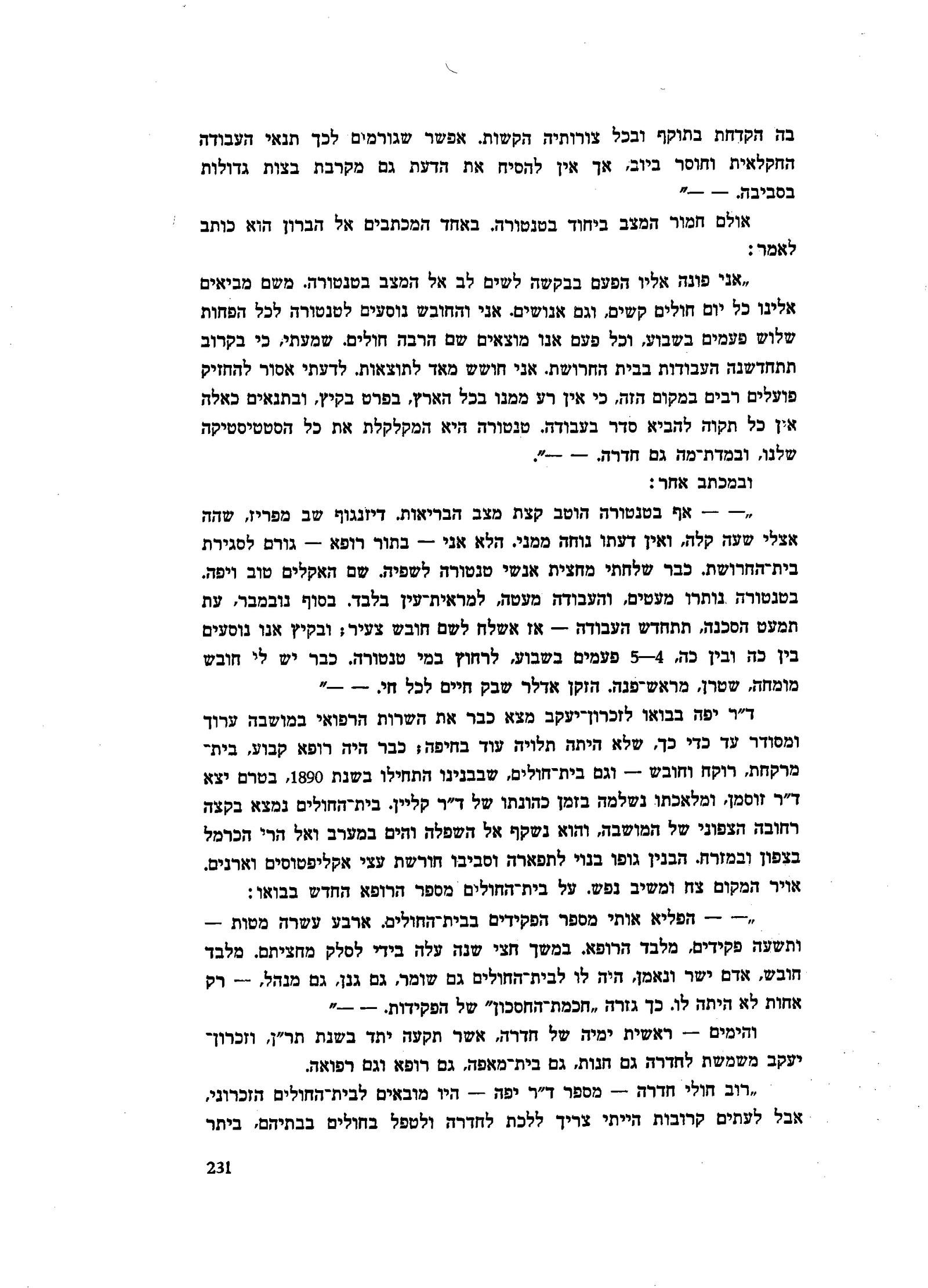 ״אני פונה אליו הפעם בבקשה לשים לב אל המצב בטנטורה. משם מביאים אלינו כל יום חולים קשים, וגם אנושים. אני והחובש נוסעים לטנטורה לכל הפחות שלוש פעמים בשבוע, וכל פעם אנו מוצאים שם הרבה חולים. שמעתי, כי בקרוב תתחדשנה העבודות בבית החרושת. אני חושש מאד לתוצאות. לדעתי אסור להחזיק פועלים רבים במקום הזה, כי אין רע ממנו בכל הארץ, בפרט בקיץ, ובתנאים כאלה אין כל תקוה להביא סדר בעבודה. טנטורה היא המקלקלת את כל הסטטיסטיקה שלנו, ובמדת־מה גם חדרה. - -״.