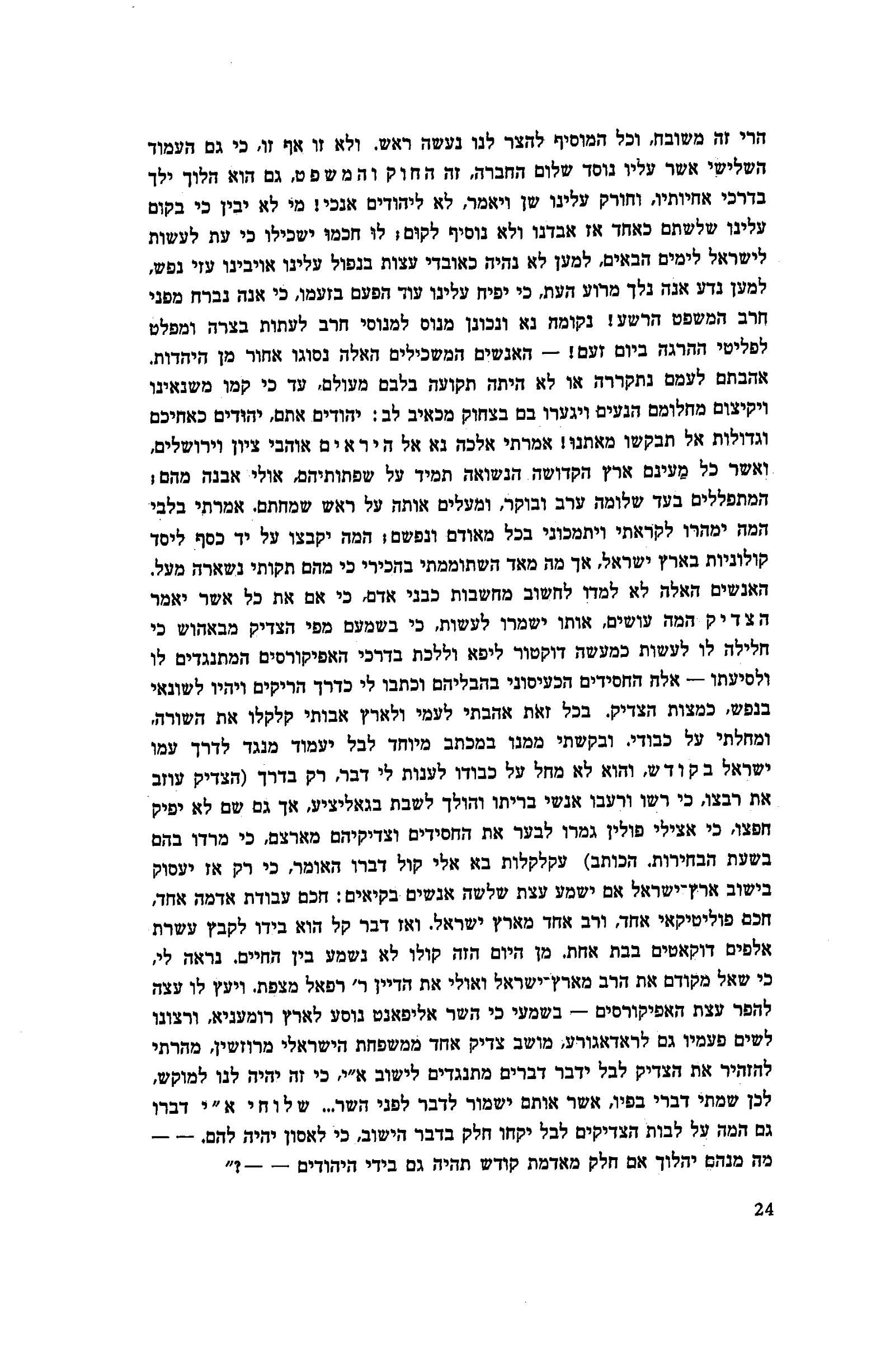 הרי זה משובח, וכל המוסיף להצר לנו נעשה ראש. ולא זו אף זו, כי גם העמוד השלישי אשר עליו נוסד שלום החברה, זה החוק והמשפט, גם הוא הלוך ילך בדרכי אחיותיו, וחורק עלינו שן ויאמר, לא ליהודים אנכי! מי לא יבין כי בקום עלינו שלשתם כאחד אז אבדנו ולא נוסיף לקום; לו חכמו ישכילו כי עת לעשות לישראל לימים הבאים, למען לא נהיה כאובדי עצות בנפול עלינו אויבינו עזי נפש, למען נדע אנה נלך מרוע העת, כי יפיח עלינו עוד הפעם בזעמו, כי אנה נברח מפני חרב המשפט הרשע! נקומה נא ונכונן מנוס למנוסי חרב לעתות בצרה ומפלט לפליטי ההרגה ביום זעם! — האנשים המשכילים האלה נסוגו אחור מן היהדות. אהבתם לעמם נתקררה או לא היתה תקועה בלבם מעולם, עד כי קמו משנאינו ויקיצום מחלומם הנעים ויגערו בם בצחוק מכאיב לב: יהודים אתם, יהודים כאחיכם וגדולות אל תבקשו מאתנו! אמרתי אלכה נא אל היראים אוהבי ציון וירושלים, ואשר כל מעינם ארץ הקדושה, הנשואה תמיד על שפתותיהם, אולי אבנה מהם; המתפללים בעד שלומה ערב ובוקר, ומעלים אותה על ראש שמחתם. אמרתי בלבי המה ימהרו לקראתי ויתמכוני בכל מאודם ונפשם; המה יקבצו על יד כסף ליסד קולוניות בארץ ישראל, אך מה מאד השתוממתי בהכירי כי מהם תקותי נשארה מעל. האנשים האלה לא למדו לחשוב מחשבות כבני אדם, כי אם את כל אשר יאמר הצדיק המה עושים, אותו ישמרו לעשות, כי בשמעם מפי הצדיק מבאהוש כי חלילה לו לעשות כמעשה דוקטור ליפא וללכת בדרכי האפיקורסים המתנגדים לו ולסיעתו – אלה החסידים הכעיסוני בהבליהם וכתבו לי כדרך הריקים ויהיו לשונאי בנפש, כמצות הצדיק. בכל זאת אהבתי לעמי ולארץ אבותי קלקלו את השורה, ומחלתי על כבודי, ובקשתי ממנו במכתב מיוחד לבל יעמוד מנגד לדרך עמו ישראל בקודש, והוא לא מחל על כבודו לענות לי דבר, רק בדרך (הצדיק עוזב את רבצו, כי רשו ורעבו אנשי בריתו והולך לשבת בגאליציע, אך גם שם לא יפיק חפצו, כי אצילי פולין גמרו לבער את החסידים וצדיקיהם מארצם, כי מרדו בהם בשעת הבחירות. הכותב) עקלקלות בא אלי קול דברו האומר, כי רק אז יעסוק בישוב ארץ־ישראל אם ישמע עצת שלשה אנשים בקיאים: חכם עבודת אדמה אחד, חכם פוליטיקאי אחד, ורב אחד מארץ ישראל. ואז דבר קל הוא בידו לקבץ עשרת אלפים דוקאטים בבת אחת. מן היום הזה קולו לא נשמע בין החיים. נראה לי, כי שאל מקודם את הרב מארץ־ישראל ואולי את הדיין ר' רפאל מצפת. ויעץ לו עצה להפר עצת האפיקורסים — בשמעי כי השר אליפאנט נוסע לארץ רומעניא, ורצונו לשים פעמיו גם לראדאגורע, מושב צדיק אחד ממשפחת הישראלי מרוזשין, מהרתי להזהיר את הצדיק לבל ידבר דברים מתנגדים לישוב א״י, כי זה יהיה לנו למוקש, לכן שמתי דברי בפיו, אשר אותם ישמור לדבר לפני השר... שלוחי א״י דברו גם המה על לבות הצדיקים לבל יקחו חלק בדבר הישוב, כי לאסון יהיה להם. — — מה מנהם יהלוך אם חלק מאדמת קודש תהיה גם בידי היהודים — — ?״
