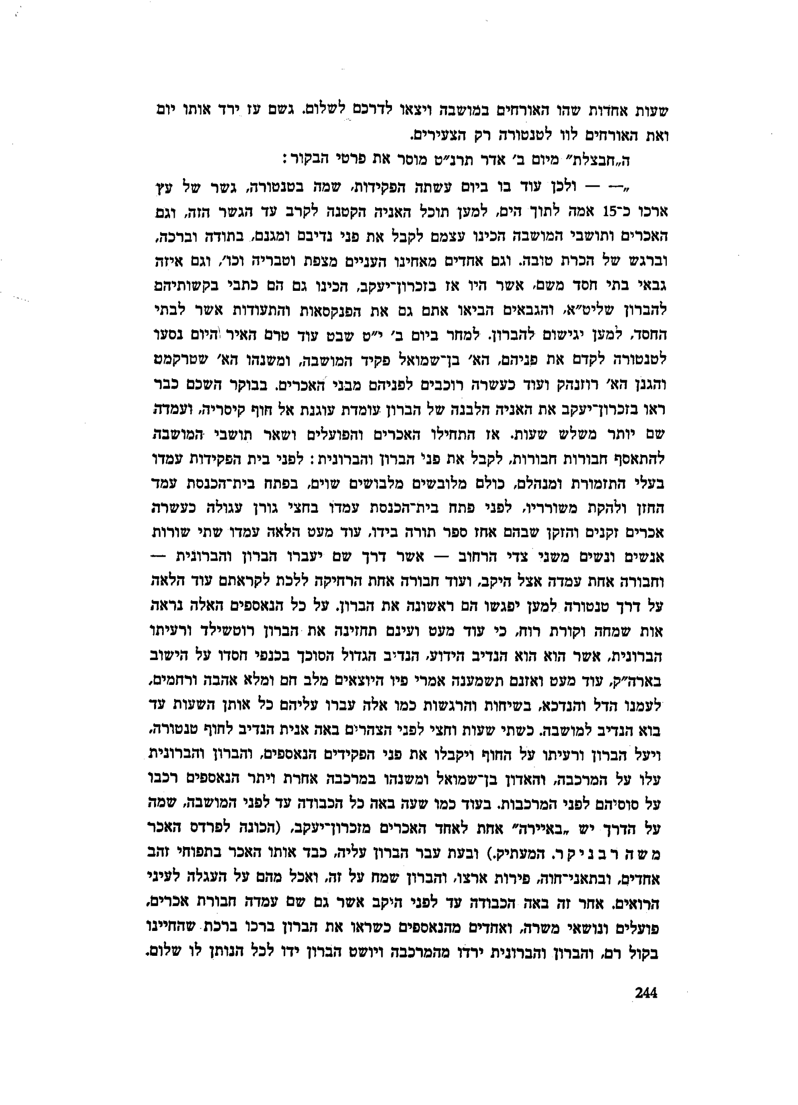 משה רבניקר . המעתיק.) ובעת עבר הברון עליה, כבד אותו האכר בתפוחי זהב אחדים, ובתאני־חוה, פירות ארצו, והברון שמח על זה, ואכל מהם על העגלה לעיני הרואים. אחר זה באה הכבודה עד לפני היקב אשר גם שם עמדה חבורת אכרים, פועלים ונושאי משרה, ואחדים מהנאספים כשראו את הברון ברכו ברכת שהחיינו בקול רם, והברון והברונית ירדו מהמרכבה ויושט הברון ידו לכל הנותן לו שלום.