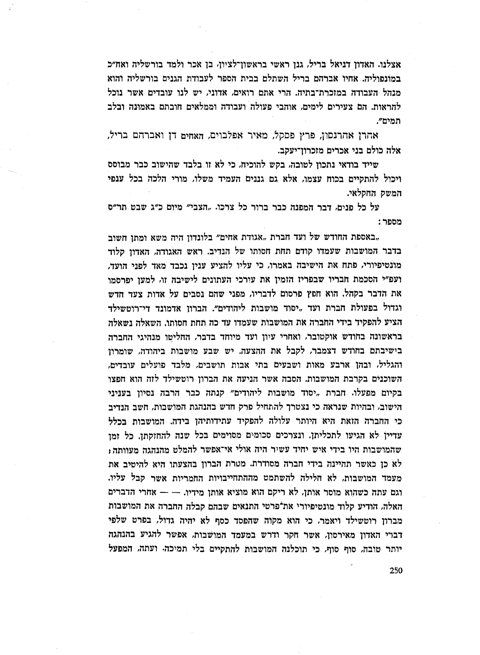 ״באספת החודש של ועד חברת ״אגודת אחים״ בלונדון היה משא ומתן חשוב בדבר המושבות שעמדו קודם תחת חסותו של הנדיב. ראש האגודה, האדון קלוד מונטיפיורי, פתח את הישיבה באמרו, כי עליו להציע ענין נכבד מאד לפני הועד, ועפ״י הסכמת חבריו שבפריז הזמין את עורכי העתונים לישיבה זו, למען יפרסמו את הדבר בקהל. הוא חפץ פרסום לדבריו, מפני שהם נסבים על אדות צעד חדש וגדול בפעולת חברת ועד ״יסוד מושבות ליהודים״. הברון אדמונד די־רוטשילד הציע להפקיד בידי החברה את המושבות שעמדו עד כה תחת חסותו. השאלה נשאלה בראשונה בחודש אוקטובר, ואחרי עיון ועד מיוחד בדבר, החליטו מנהיגי החברה בישיבתם בחודש דצמבר, לקבל את ההצעה. יש שבע מושבות ביהודה, שומרון והגליל, ובהן ארבע מאות ושבעים בתי אבות תושבים, מלבד פועלים עובדים, השוכנים בקרבת המושבות. הסבה אשר הניעה את הברון רוטשילד לזה הוא חפצו בקיום מפעלו. חברת ״יסוד מושבות ליהודים״ קנתה כבר הרבה נסיון בעניני הישוב, ובהיות שנראה כי נצטרך להתחיל פרק חדש בהנהגת המושבות, חשב הנדיב כי החברה הזאת היא היותר עלולה להפקיד עתידותיהן בידה. המושבות בכלל עדיין לא הגיעו לתכליתן. ונצרכים סכומים מסוימים בכל שנה להחזקתן. כל זמן שהמושבות היו בידי איש יחיד עשיר היה אולי אי־אפשר להמלט מהנהגה מעוותה; לא כן כאשר תהיינה בידי חברה מסודרת. מטרת הברון בהצעתו היא להיטיב את מעמד המושבות, לא חלילה להשתמט מההתחייבויות החמריות אשר קבל עליו. וגם עתה כשהוא מוסר אותן, לא ריקם הוא מוציא אותן מידיו. — — אחרי הדברים האלה, הודיע קלוד מונטיפיורי את פרטי התנאים שבהם קבלה החברה את המושבות מברון רוטשילד ויאמר, כי הוא מקוה שהפסד כסף לא יהיה גדול, בפרט שלפי דברי האדון מאירסון, אשר חקר ודרש במעמד המושבות, אפשר להגיע בהנהגה יותר טובה, סוף סוף, כי תוכלנה המושבות להתקיים בלי תמיכה. ועתה, המפעל
