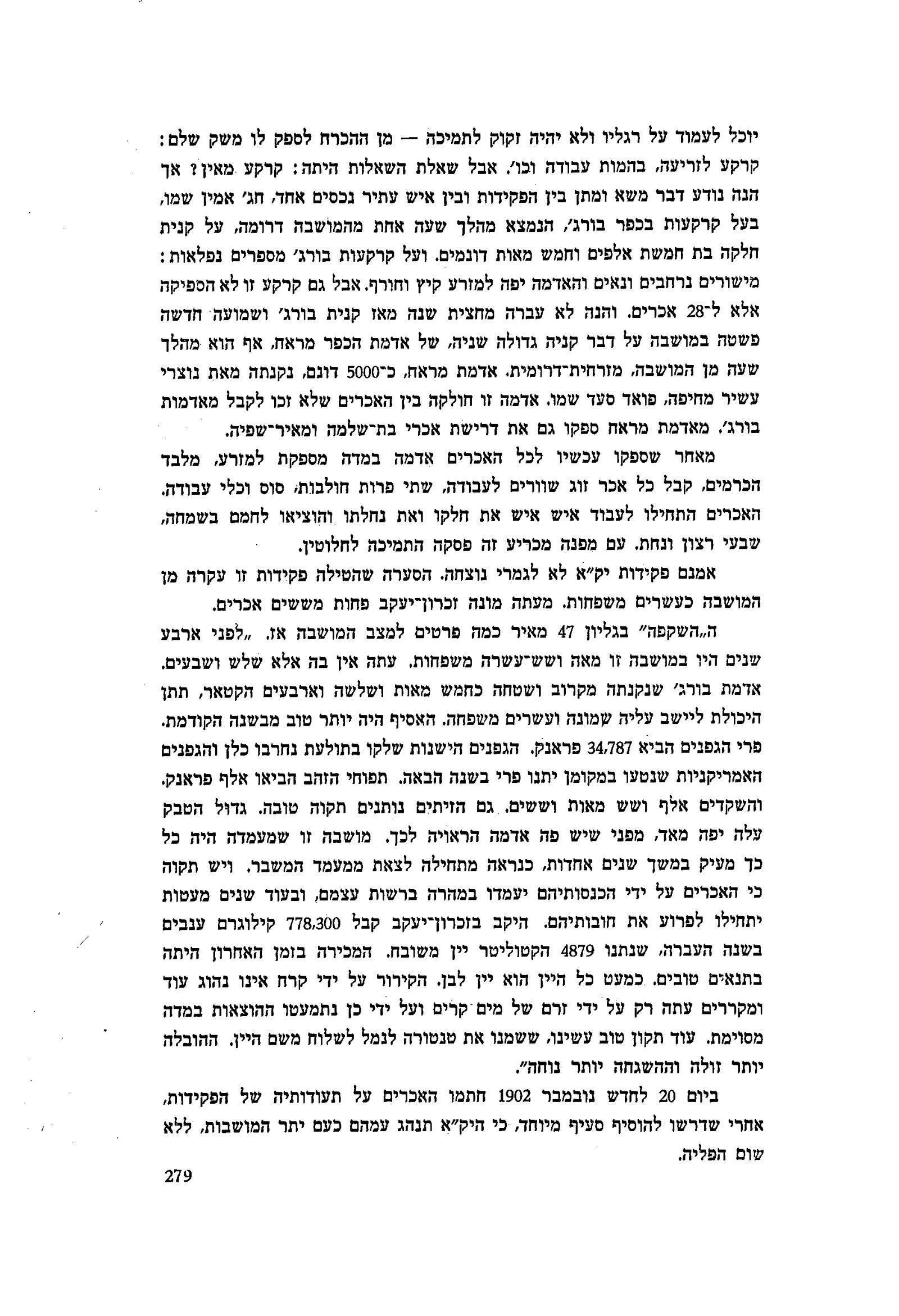 יוכל לעמוד על רגליו ולא יהיה זקוק לתמיכה — מן ההכרח לספק לו משק שלם: קרקע לזריעה, בהמות עבודה וכו׳. אבל שאלת השאלות היתה: קרקע מאין? אך הנה נודע דבר משא ומתן בין הפקידות ובין איש עתיר נכסים אחד, חג׳ אמין שמו, בעל קרקעות בכפר בורג׳, הנמצא מהלך שעה אחת מהמושבה דרומה, על קנית חלקה בת חמשת אלפים וחמש מאות דונמים. ועל קרקעות בורג׳ מספרים נפלאות: מישורים נרחבים ונאים והאדמה יפה למזרע קיץ וחורף, אבל גם קרקע זו לא הספיקה אלא ל-28 אכרים. והנה לא עברה מחצית שנה מאז קנית בורג׳ ושמועה חדשה פשטה במושבה על דבר קניה גדולה שניה, של אדמת הכפר מראח, אף הוא מהלך שעה מן המושבה, מזרחית־דרומית. אדמת מראח, כ־5000 דונם, נקנתה מאת נוצרי עשיר מחיפה, פואד סעד שמו. אדמה זו חולקה בין האכרים שלא זכו לקבל מאדמות בורג׳. מאדמת מראח ספקו גם את דרישת אכרי בת־שלמה ומאיר־שפיה.