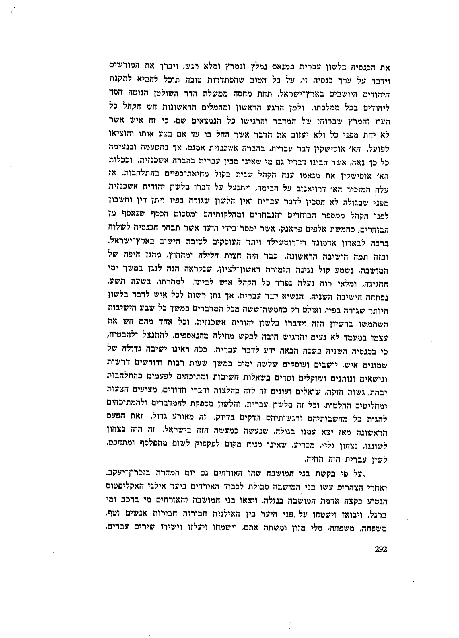 דרויאנוב על הבימה, ויתנצל על דברו בלשון יהודית אשכנזית מפני שבגולה לא הסכין לדבר עברית ואין הלשון שגורה בפיו ויתן דין וחשבון לפני הקהל ממספר הבוחרים והנבחרים ומחלקותיהם ומסכום הכסף שנאסף מן הבוחרים, כחמשת אלפים פראנק, אשר ימסר בידי הועד אשר תבחר הכנסיה לשלוח ברכה לבארון אדמונד די־רוטשילד ויתר העוסקים לטובת הישוב בארץ־ישראל. ובזה תמה הישיבה הראשונה. כבר היה חצות הלילה ומהחוץ, מהגן היפה של המושבה, נשמע קול נגינת תזמורת ראשון־לציון, שנקראה הנה לנגן במשך ימי החגיגה, ומלאי רוח נעלה נפרד כל הקהל איש לביתו. למחרתו, בשעה תשע, נפתחה הישיבה השניה. הנשיא דבר עברית, אך נתן רשות לכל איש לדבר בלשון היותר שגורה בפיו, ואולם רק כחמשה־ששה מכל המדברים במשך כל שבע הישיבות השתמשו ברשיון הזה וידברו בלשון יהודית אשכנזית, וכל אחד מהם חש את עצמו במעמד לא נעים והרגיש חובה לבקש מחילה מהנאספים, להתנצל ולהבטיח, כי בכנסיה השניה בשנה הבאה ידע לדבר עברית. ככה ראינו ישיבה גדולה של שמונים איש, יושבים ועוסקים שלשה ימים במשך שעות רבות ודורשים דרשות ונושאים ונותנים ושוקלים וטרים בשאלות חשובות ומתוכחים לפעמים בהתלהבות ובהתרגשות חזקה, שואלים ועונים זה לזה בהלצות ודברי חדודים, מציעים הצעות ומחליטים החלטות, וכל זה בלשון עברית, והלשון מספקת להמדברים ולהמתוכחים להגות כל מחשבותיהם ורגשותיהם הדקים בדיוק. זה מאורע גדול. זאת הפעם הראשונה מאז יצא עמנו בגולה, שנעשה כמעשה הזה בישראל. זה היה נצחון לשוננו, נצחון גלוי, מכריע, שאינו מניח מקום לפקפוק לשום מתפלסף ומתחכם. לשון עברית חיה תחיה.