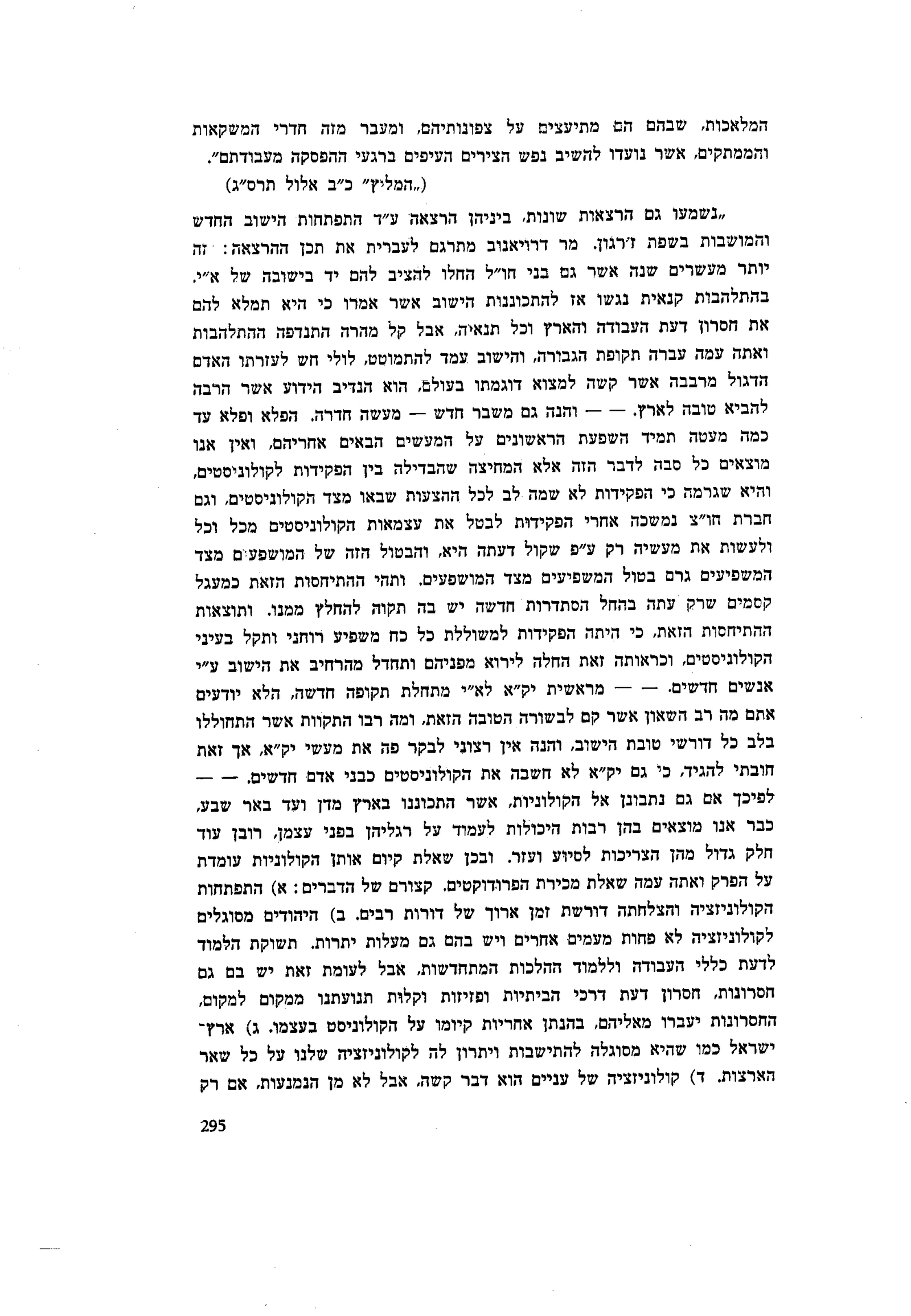 לא חשבה את הקולוניסטים כבני אדם חדשים. — — לפיכך אם גם נתבונן אל הקולוניות, אשר התכוננו בארץ מדן ועד באר שבע, כבר אנו מוצאים בהן רבות היכולות לעמוד על רגליהן בפני עצמן, רובן עוד חלק גדול מהן הצריכות לסיוע ועזר. ובכן שאלת קיום אותן הקולוניות עומדת על הפרק ואתה עמה שאלת מכירת הפרודוקטים. קצורם של הדברים: א) התפתחות הקולוניזציה והצלחתה דורשת זמן ארוך של דורות רבים. ב) היהודים מסוגלים לקולוניזציה לא פחות מעמים אחרים ויש בהם גם מעלות יתרות. תשוקת הלמוד לדעת כללי העבודה וללמוד ההלכות המתחדשות, אבל לעומת זאת יש בם גם חסרונות, חסרון דעת דרכי הביתיות ופזיזות וקלות תנועתנו ממקום למקום, החסרונות יעברו מאליהם, בהנתן אחריות קיומו על הקולוניסט בעצמו. ג) ארץ־ישראל כמו שהיא מסוגלה להתישבות ויתרון לה לקולוניזציה שלנו על כל שאר הארצות. ד) קולוניזציה של עניים הוא דבר קשה, אבל לא מן הנמנעות, אם רק