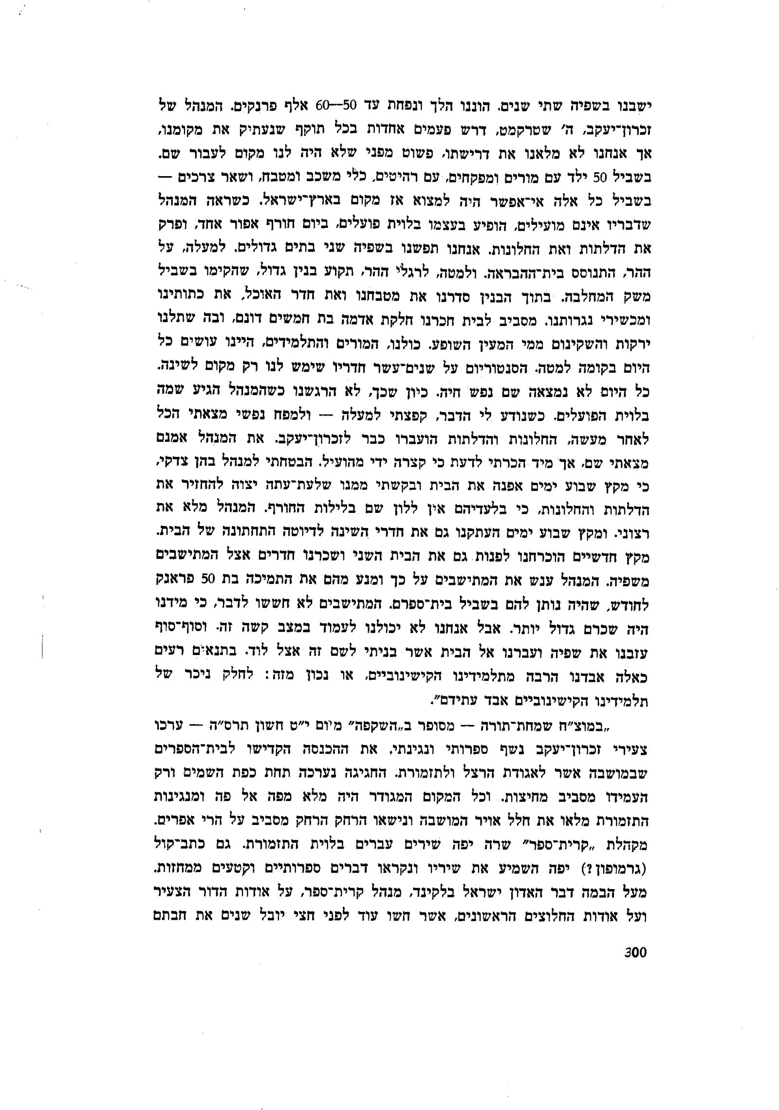 ישבנו בשפיה שתי שנים. הוננו הלך ונפחת עד 60-50 אלף פרנקים. המנהל של זכרון־יעקב,