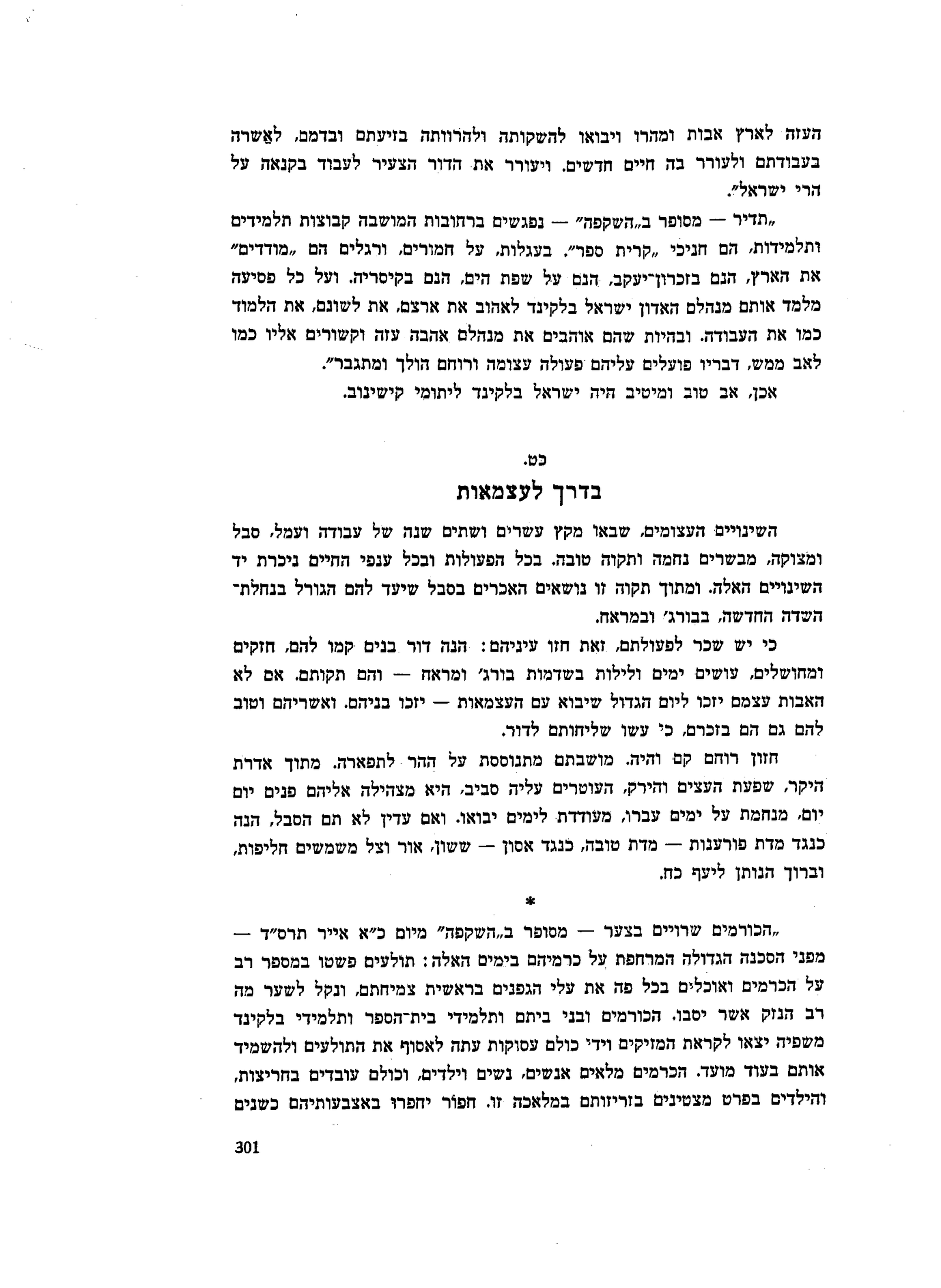 העזה לארץ אבות ומהרו ויבואו להשקותה ולהרוותה בזיעתם ובדמם, לאשרה בעבודתם ולעורר בה חיים חדשים. ויעורר את הדור הצעיר לעבוד בקנאה על הרי ישראל״.