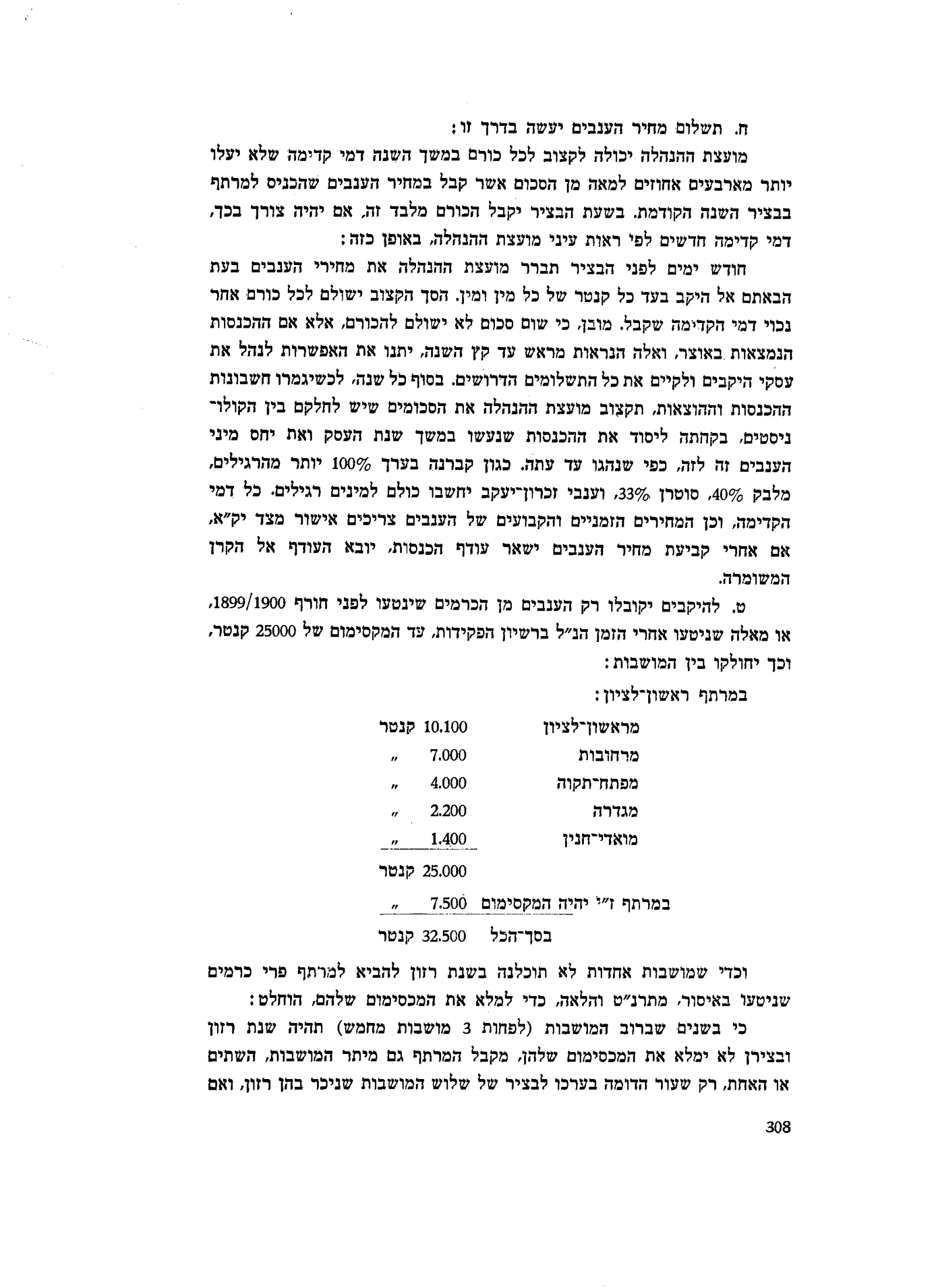 ט. להיקבים יקובלו רק הענבים מן הכרמים שינטעו לפני חורף 1899/1900, או מאלה שניטעו אחרי הזמן הנ״ל ברשיון הפקידות, עד המקסימום של 25000 קנטר, וכך יחולקו בין המושבות: