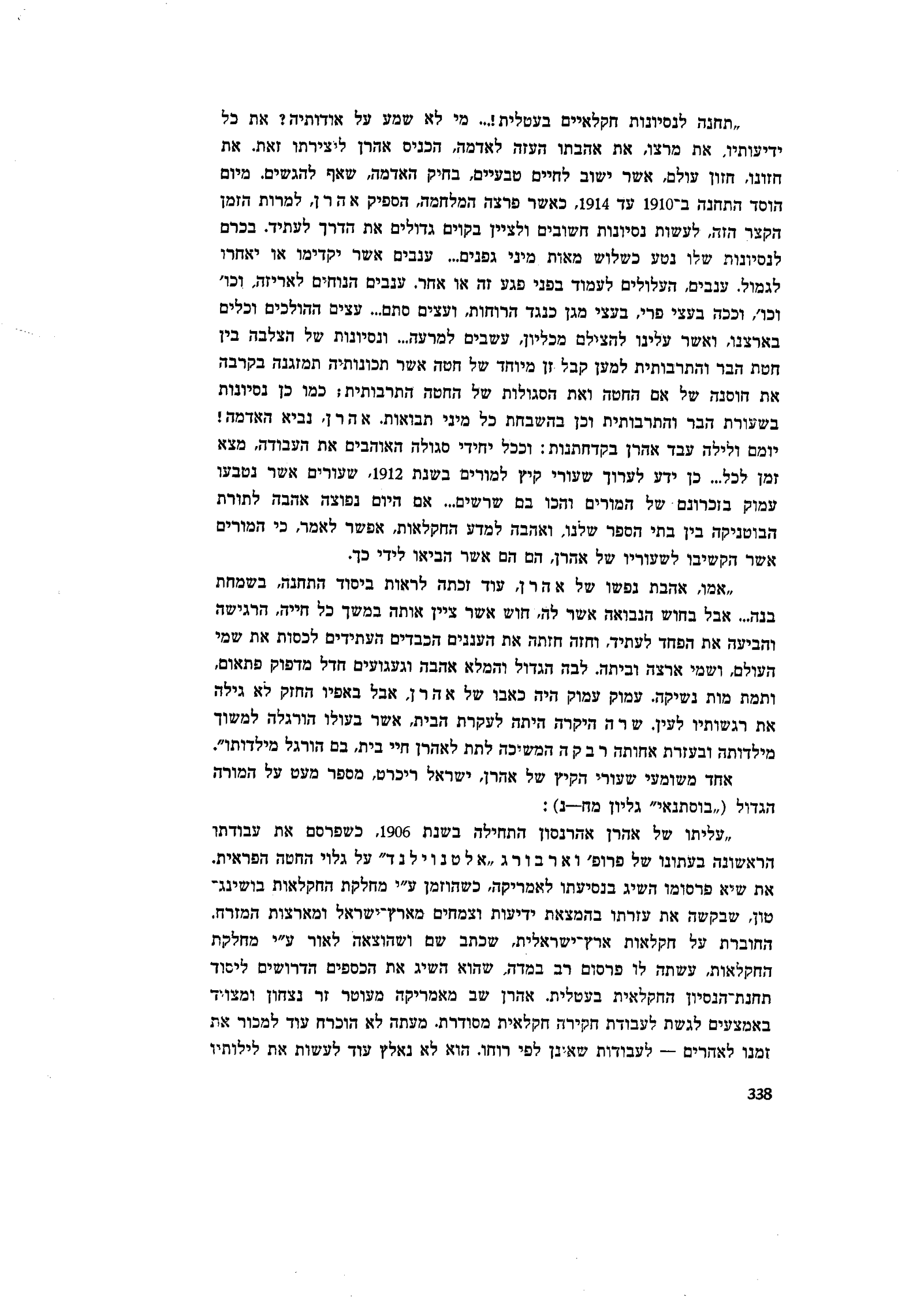 אהרן , נביא האדמה! יומם ולילה עבד אהרן בקדחתנות: וככל יחידי סגולה האוהבים את העבודה, מצא זמן לכל... כן ידע לערוך שעורי קיץ למורים בשנת 1912, שעורים אשר נטבעו עמוק בזכרונם של המורים והכו בם שרשים... אם היום נפוצה אהבה לתורת הבוטניקה בין בתי הספר שלנו, ואהבה למדע החקלאות, אפשר לאמר, כי המורים אשר הקשיבו לשעוריו של אהרן, הם הם אשר הביאו לידי כך.