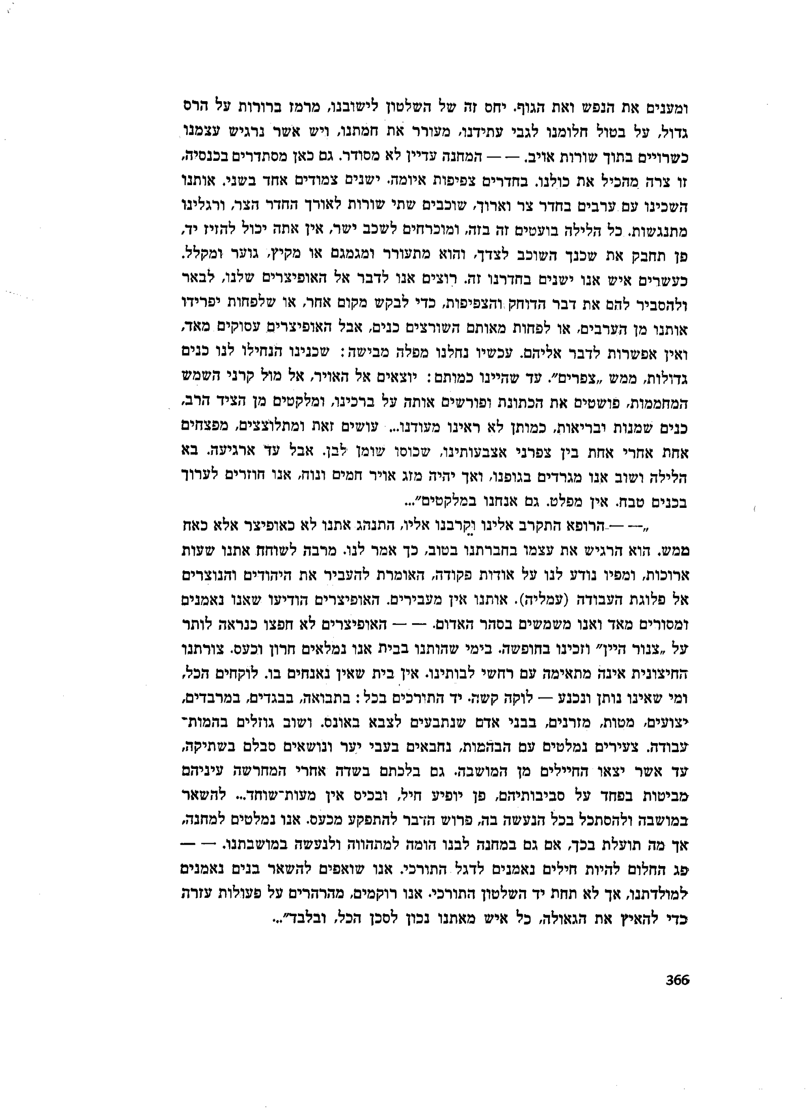 ומענים את הנפש ואת הגוף. יחס זה של השלטון לישובנו, מרמז ברורות על הרס גדול, על בטול חלומנו לגבי עתידנו, מעורר את חמתנו, ויש אשר נרגיש עצמנו כשרויים בתוך שורות אויב. — — המחנה עדיין לא מסודר. גם כאן מסתדרים בכנסיה. זו צרה מהכיל את כולנו. בחדרים צפיפות איומה. ישנים צמודים אחד בשני. אותנו השכינו עם ערבים בחדר צר וארוך, שוכבים שתי שורות לאורך החדר הצר, ורגלינו מתנגשות. כל הלילה בועטים זה בזה, ומוכרחים לשכב ישר, אין אתה יכול להזיז יד, פן תחבק את שכנך השוכב לצדך, והוא מתעורר ומגמגם או מקיץ, גוער ומקלל. כעשרים איש אנו ישנים בחדרנו זה. רוצים אנו לדבר אל האופיצרים שלנו, לבאר ולהסביר להם את דבר הדוחק והצפיפות, כדי לבקש מקום אחר, או שלפחות יפרידו אותנו מן הערבים, או לפחות מאותם השורצים כנים, אבל האופיצרים עסוקים מאד, ואין אפשרות לדבר אליהם. עכשיו נחלנו מפלה מבישה: שכנינו הנחילו לנו כנים גדולות, ממש ״צפרים״. עד שהיינו כמותם: יוצאים אל האויר, אל מול קרני השמש המחממות, פושטים את הכתונת ופורשים אותה על ברכינו, ומלקטים מן הציד הרב כנים שמנות ובריאות, כמותן לא ראינו מעודנו... עושים זאת ומתלוצצים, מפצחים אחת אחרי אחת בין צפרני אצבעותינו, שכוסו שומן לבן. אבל עד ארגיעה. בא הלילה ושוב אנו מגרדים בגופנו, ואך יהיה מזג אויר חמים ונוח, אנו חוזרים לערוך בכנים טבח. אין מפלט. גם אנחנו במלקטים״...
