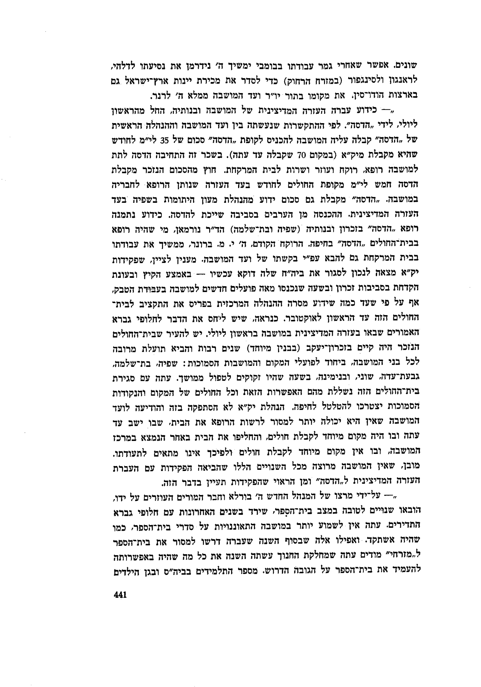 לא הסתפקה בזה והודיעה לועד המושבה שאין היא יכולה יותר למסור לרשות הרופא את הבית, שבו ישב עד עתה ובו היה מקום מיוחד לקבלת חולים, והחליפו את הבית באחר הנמצא במרכז המושבה, ובו אין מקום מיוחד לקבלת חולים ולפיכך אינו מתאים לתעודתו. מובן, שאין המושבה מרוצה מכל השנויים הללו שהביאה הפקידות עם העברת העזרה המדיצינית ל״הדסה״ ומן הראוי שהפקידות תעיין בדבר הזה.
