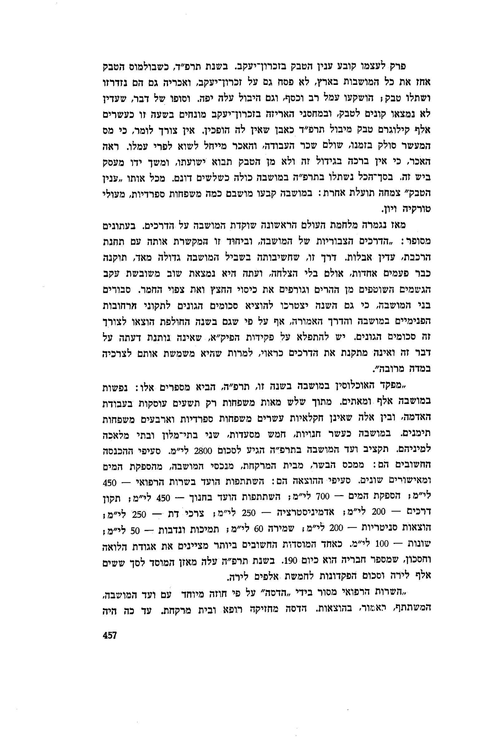 כאבן שאין לה הופכין. אין צורך לומר, כי מס המעשר סולק בזמנו, שולם שכר העבודה, והאכר מייחל לשוא לפרי עמלו. ראה האכר, כי אין ברכה בגידול זה ולא מן הטבק תבוא ישועתו, ומשך ידו מעסק ביש זה. בסך־הכל נשתלו בתרפ״ה במושבה כולה כשלשים דונם, מכל אותו ״ענין הטבק״ צמחה תועלת אחרת: במושבה קבעו מושבם כמה משפחות ספרדיות, מעולי טורקיה ויון.