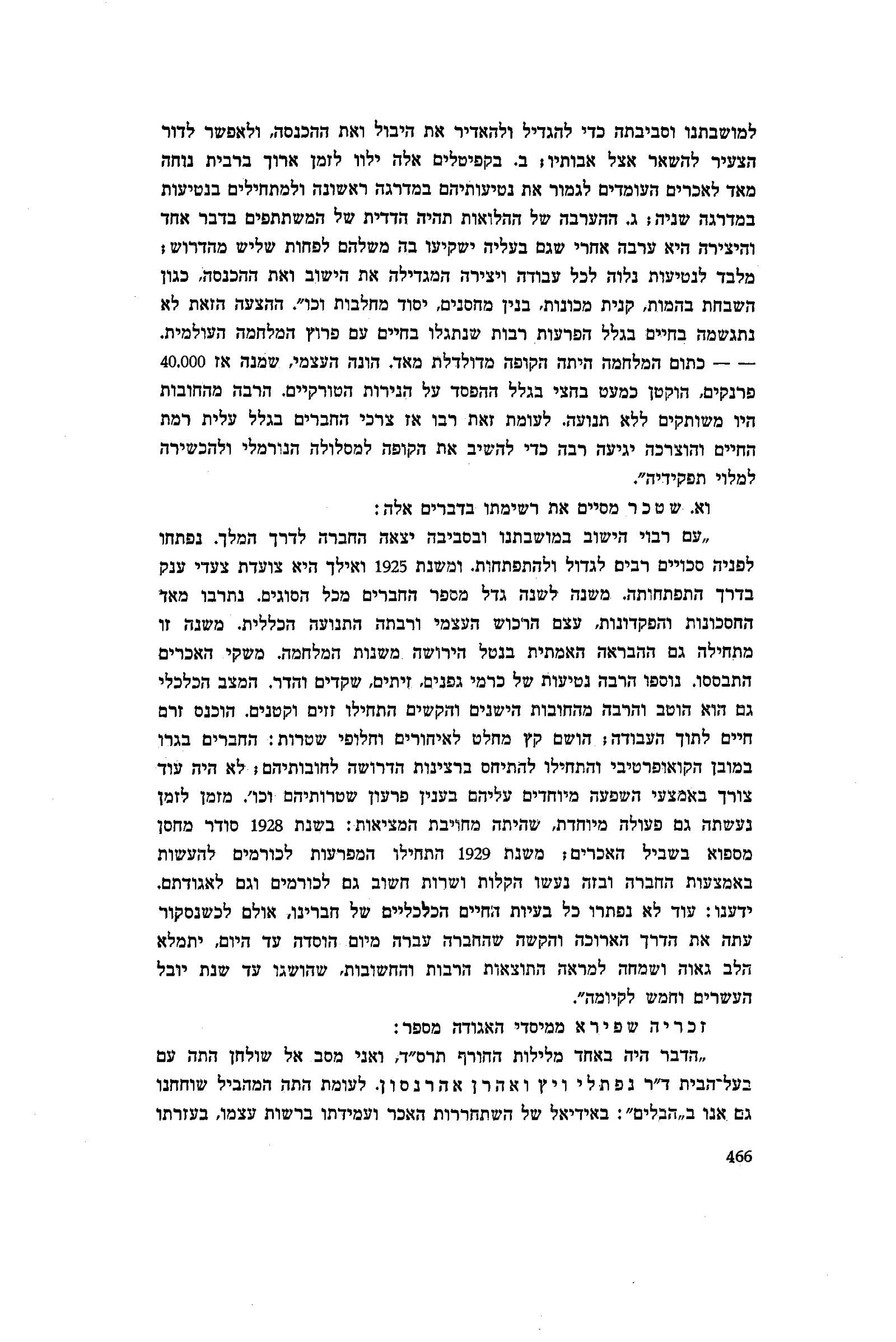למושבתנו וסביבתה כדי להגדיל ולהאדיר את היבול ואת ההכנסה, ולאפשר לדור הצעיר להשאר אצל אבותיו; ב. בקפיטלים אלה ילוו לזמן ארוך ברבית נוחה מאד לאכרים העומדים לגמור את נטיעותיהם במדרגה ראשונה ולמתחילים בנטיעות במדרגה שניה; ג. ההערבה של ההלואות תהיה הדדית של המשתתפים בדבר אחד והיצירה היא ערבה אחרי שגם בעליה ישקיעו בה משלהם לפחות שליש מהדרוש; מלבד לנטיעות נלוה לכל עבודה ויצירה המגדילה את הישוב ואת ההכנסה, כגון השבחת בהמות, קנית מכונות, בנין מחסנים, יסוד מחלבות וכו״. ההצעה הזאת לא נתגשמה בחיים בגלל הפרעות רבות שנתגלו בחיים עם פרוץ המלחמה העולמית. — — כתום המלחמה היתה הקופה מדולדלת מאד. הונה העצמי, שמנה אז 40.000 פרנקים, הוקטן כמעט בחצי בגלל ההפסד על הנירות הטורקיים. הרבה מהחובות היו משותקים ללא תנועה. לעומת זאת רבו אז צרכי החברים בגלל עלית רמת החיים והוצרכה יגיעה רבה כדי להשיב את הקופה למסלולה הנורמלי ולהכשירה למלוי תפקידיה״.