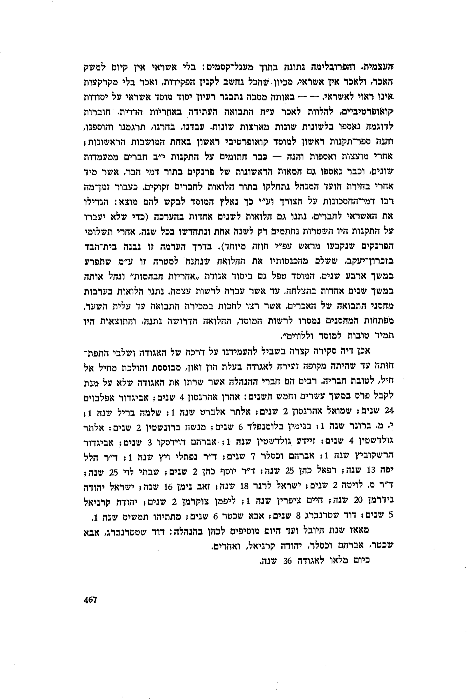 התבואה העתידה באחריות הדדית. חוברות לדוגמה נאספו בלשונות שונות מארצות שונות. עבדנו, בחרנו, תרגמנו והוספנו והנה ספר תקנות ראשון למוסד קואופרטיבי ראשון באחת המושבות הראשונות; אחרי מועצות ואספות והנה — כבר חתומים על התקנות י״ב חברים ממעמדות שונים, וכבר נאספו גם המאות הראשונות של פרנקים בתור דמי חבר, אשר מיד אחרי בחירת הועד המנהל נתחלקו בתור הלואות לחברים זקוקים. כעבור זמן־מה רבו דמי־החסכונות על הצורך וע״י כך נאלץ המוסד לבקש להם מוצא: הגדילו את האשראי לחברים, נתנו גם הלואות לשנים אחדות בהערכה (כדי שלא יעברו על התקנות היו השטרות נחתמים רק לשנה אחת ונתחדשו בכל שנה, אחרי תשלומי הפרנקים שנקבעו מראש עפ״י חוזה מיוחד). בדרך הערמה זו נבנה בית־הבד בזכרון־יעקב, ששלם מהכנסותיו את ההלואה שנתנה למטרה זו