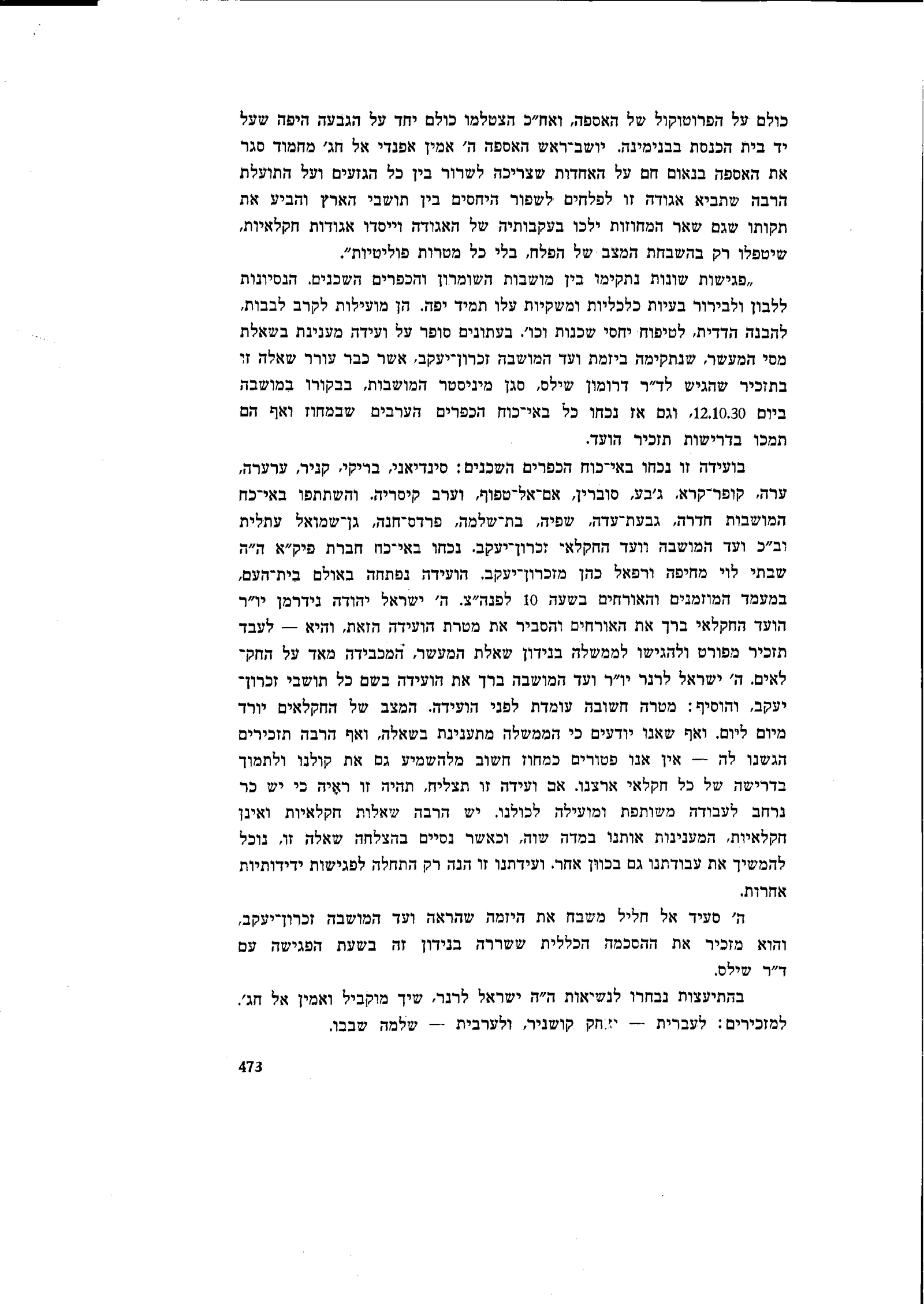 כולם על הפרוטוקול של האספה, ואח״כ הצטלמו כולם יחד על הגבעה היפה שעל יד בית הכנסת בבנימינה. יושב־ראש האספה