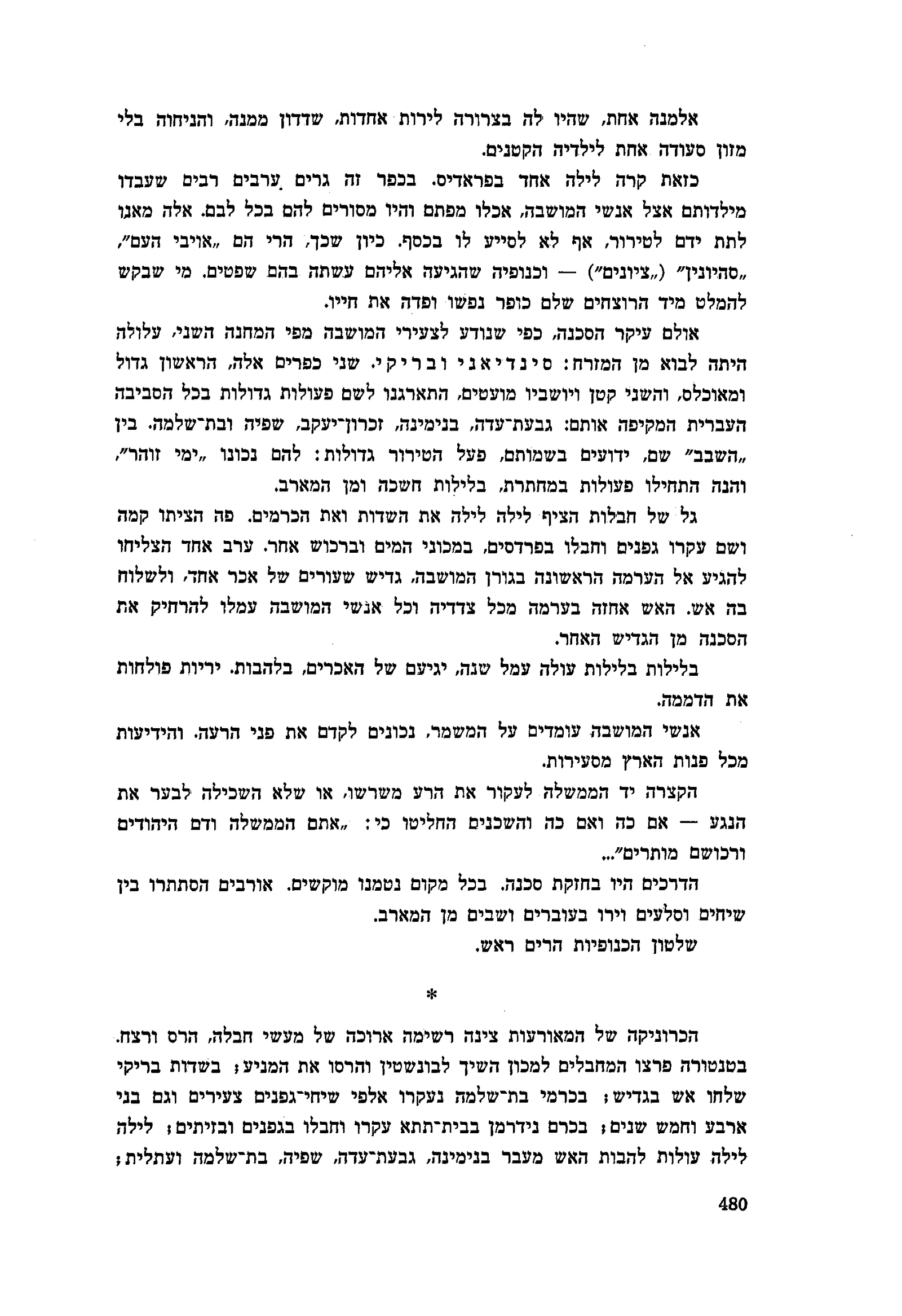 כזאת קרה לילה אחד בפראדיס. בכפר זה גרים ערבים רבים שעבדו מילדותם אצל אנשי המושבה, אכלו מפתם והיו מסורים להם בכל לבם. אלה מאנו לתת ידם לטירור, אף לא לסייע לו בכסף. כיון שכך, הרי הם ״אויבי העם״, ״סהיונין״ (ציונים״) — וכנופיה שהגיעה אליהם עשתה בהם שפטים. מי שבקש להמלט מיד הרוצחים שלם כופר נפשו ופדה את חייו.