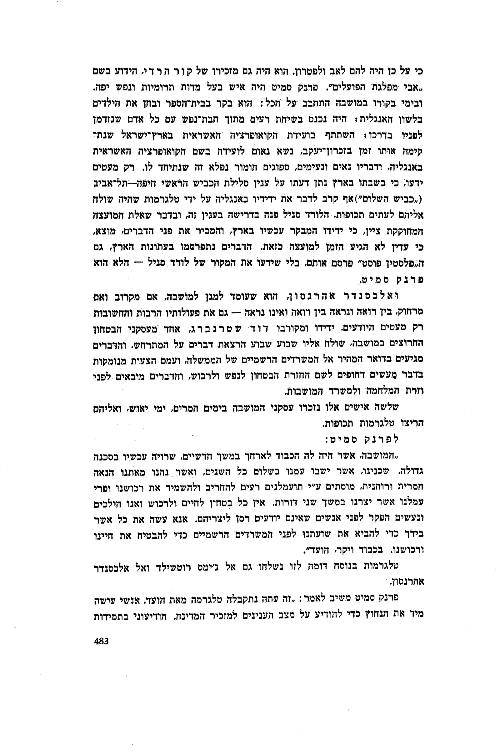כי על כן היה להם לאב ולפטרון. הוא היה גם מזכירו של קור הרדי, הידוע בשם ״אבי מפלגת הפועלים״. פרנק סמיט היה איש בעל מדות תרומיות ונפש יפה. ובימי בקורו במושבה התחבב על הכל: הוא בקר בבית־הספר ובחן את הילדים בלשון האנגלית; היה נכנס בשיחת רעים מתוך חבת־נפש עם כל אדם שנזדמן לפניו בדרכו; השתתף בועידת הקואופרציה האשראית בארץ־ישראל שנתקימה אותו זמן בזכרון־יעקב, נשא נאום לועידה בשם הקואופרציה האשראית באנגליה, ודבריו נאים ונעימים, ספוגים הומור נפלא זה שנתיחד לו. רק מעטים ידעו, כי בשבתו בארץ נתן דעתו על ענין סלילת הכביש הראשי חיפה־תל־אביב (״כביש השלום״) אף קרב לדבר את ידידיו באנגליה על ידי טלגרמות שהיה שולח אליהם לעתים תכופות. הלורד סניל פנה בדרישה בענין זה, ובדבר שאלת המועצה המחוקקת ציין, כי ידידו המבקר עכשיו בארץ, והמכיר את פני הדברים, מוצא, כי עדין לא הגיע הזמן למועצה כזאת. הדברים נתפרסמו בעתונות הארץ, גם ה״פלסטין פוסט״ פרסם אותם, בלי שידעו את המקור של לורד סניל — הלא הוא