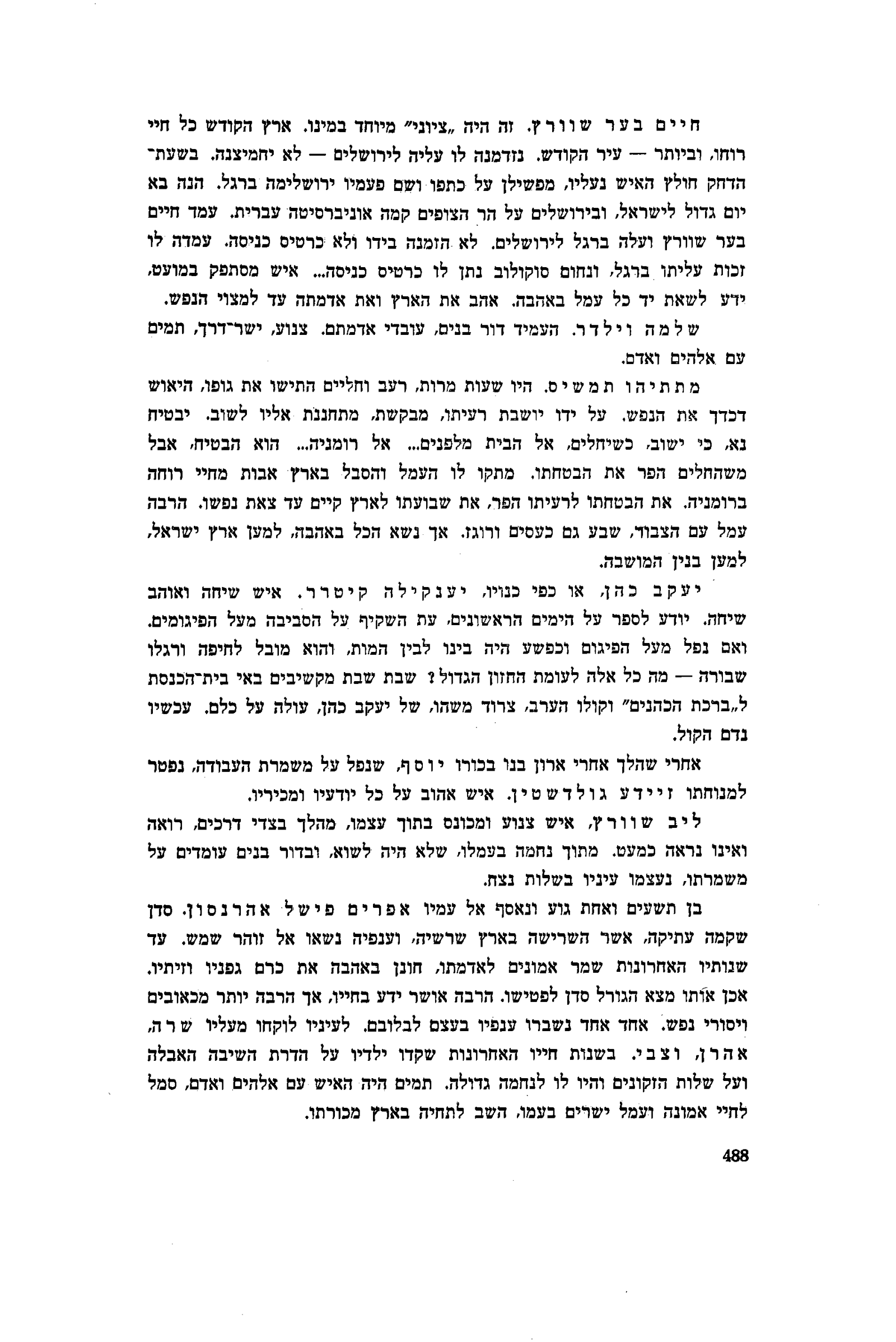 חיים בער שוורץ . זה היה ״ציוני״ מיוחד במינו. ארץ הקודש כל חיי רוחו, וביותר — עיר הקודש. נזדמנה לו עליה לירושלים — לא יחמיצנה. בשעת־הדחק חולץ האיש נעליו, מפשילן על כתפו ושם פעמיו ירושלימה ברגל. הנה בא יום גדול לישראל, ובירושלים על הר הצופים קמה אוניברסיטה עברית. עמד חיים בער שוורץ ועלה ברגל לירושלים. לא הזמנה בידו ולא כרטיס כניסה. עמדה לו זכות עליתו ברגל, ונחום סוקולוב נתן לו כרטיס כניסה... איש מסתפק במועט. ידע לשאת יד כל עמל באהבה. אהב את הארץ ואת אדמתה עד למצוי הנפש.
