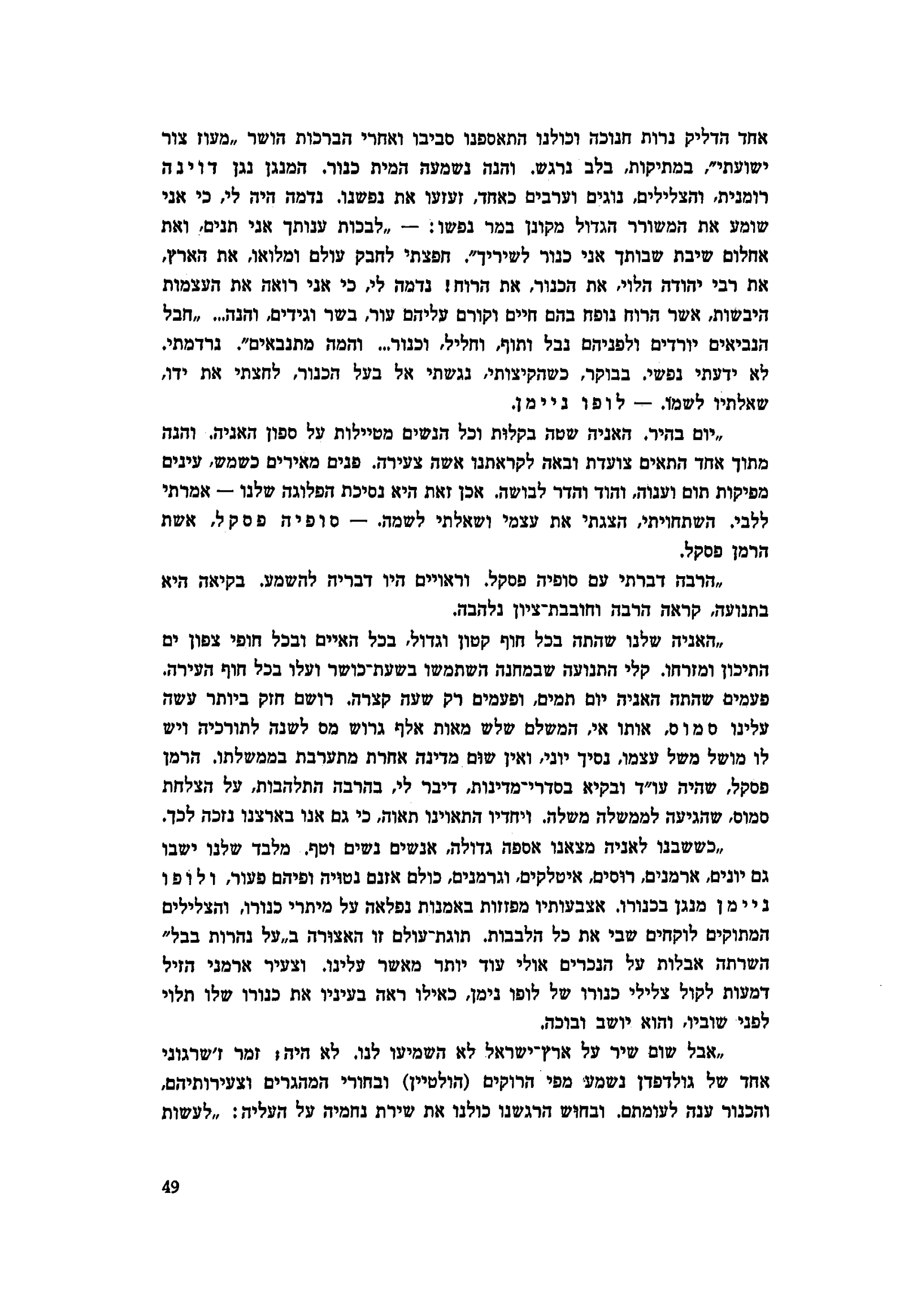 רומנית, והצלילים, נוגים וערבים כאחד, זעזעו את נפשנו. נדמה היה לי, כי אני שומע את המשורר הגדול מקונן במר נפשו: — ״לבכות ענותך אני תנים, ואת אחלום שיבת שבותך אני כנור לשיריך״. חפצתי לחבק עולם ומלואו, את הארץ, את רבי יהודה הלוי, את הכנור, את הרוח! נדמה לי, כי אני רואה את העצמות היבשות, אשר הרוח נופח בהם חיים וקורם עליהם עור, בשר וגידים. והנה... ״חבל הנביאים יורדים ולפניהם נבל ותוף, וחליל, וכנור... והמה מתנבאים״. נרדמתי. לא ידעתי נפשי. בבוקר, כשהקיצותי, נגשתי אל בעל הכנור, לחצתי את ידו, שאלתיו לשמוֹ. —