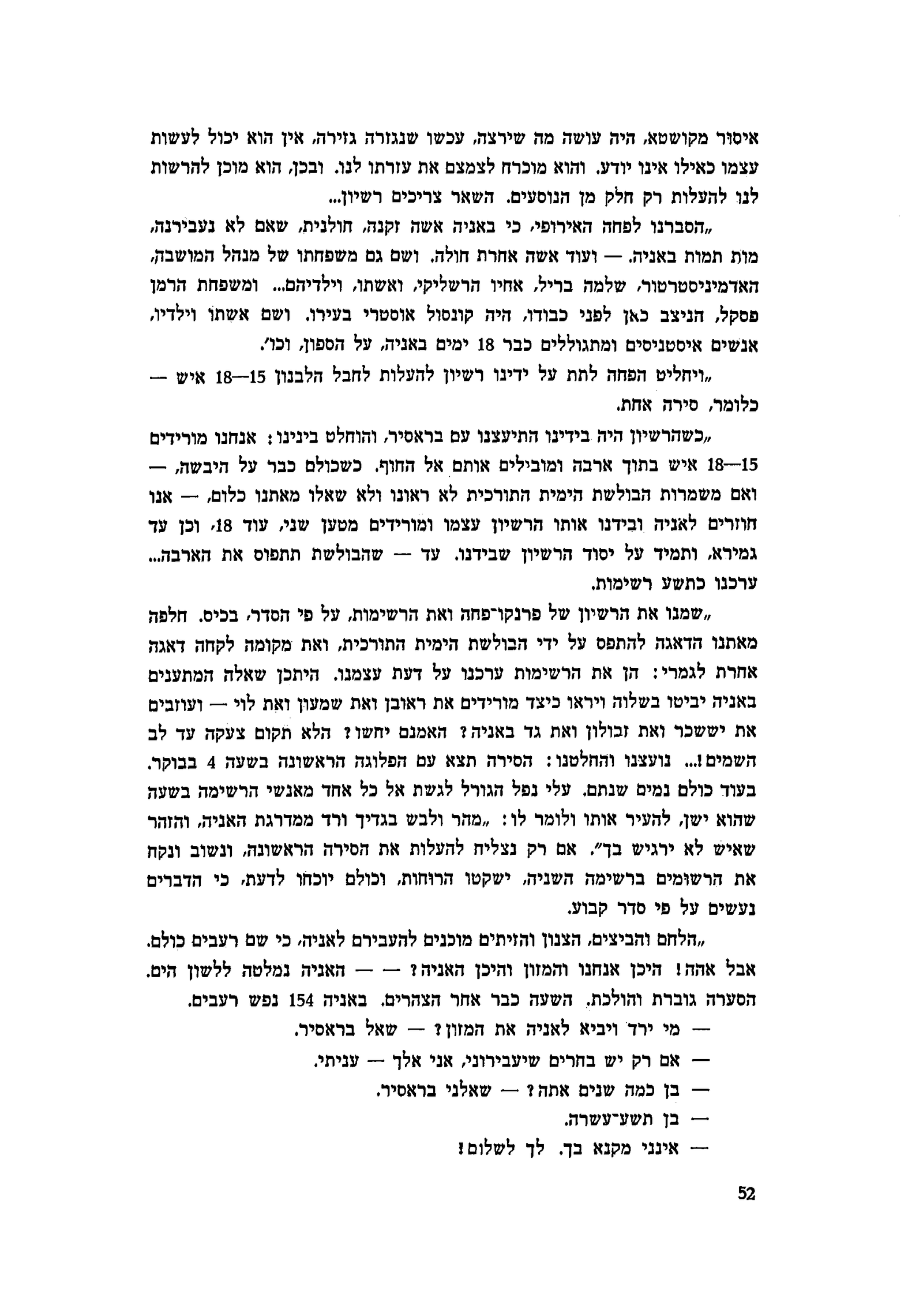 ״שמנו את הרשיון של פרנקו־פחה ואת הרשימות, על פי הסדר, בכיס. חלפה מאתנו הדאגה להתפס על ידי הבולשת הימית התורכית, ואת מקומה לקחה דאגה אחרת לגמרי: הן את הרשימות ערכנו על דעת עצמנו. היתכן שאלה המתענים באניה יביטו בשלוה ויראו כיצד מורידים את ראובן ואת שמעון ואת לוי — ועוזבים את יששכר ואת זבולון ואת גד באניה? האמנם יחשו? הלא תקום צעקה עד לב השמים! ... נועצנו והחלטנו: הסירה תצא עם הפלוגה הראשונה בשעה 4 בבוקר. בעוד כולם נמים שנתם. עלי נפל הגורל לגשת אל כל אחד מאנשי הרשימה בשעה שהוא ישן, להעיר אותו ולומר לו: ״מהר ולבש בגדיך ורד ממדרגת האניה, והזהר שאיש לא ירגיש בך״. אם רק נצליח להעלות את הסירה הראשונה, ונשוב ונקח את הרשומים ברשימה השניה, שקטו הרוחות, וכולם יוכחו לדעת, כי הדברים נעשים על פי סדר קבוע.