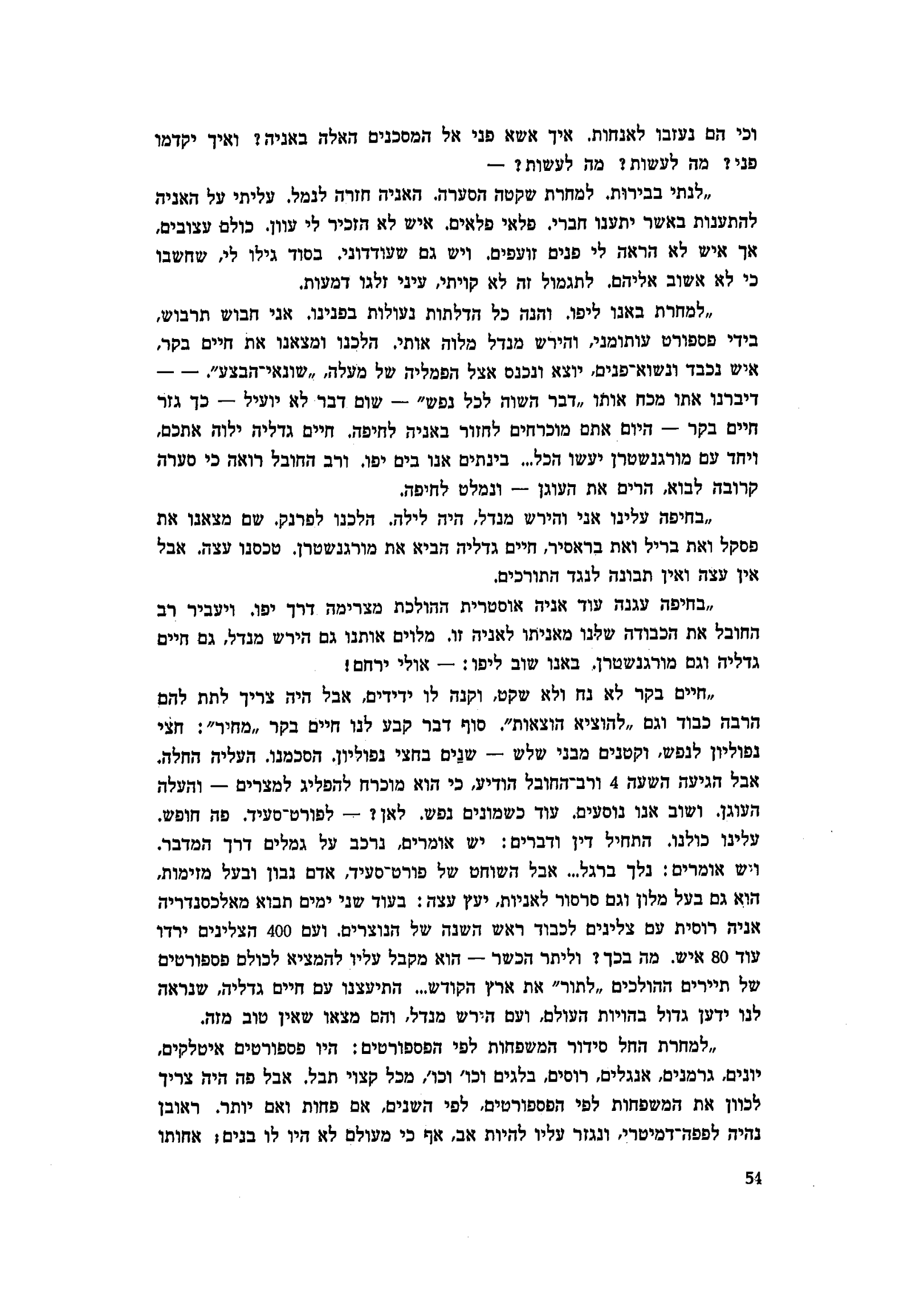 ״חיים בקר לא נח ולא שקט, וקנה לו ידידים, אבל היה צריך לתת להם הרבה כבוד וגם ״להוציא הוצאות״. סוף דבר קבע לנו חיים בקר ״מחיר״: חצי נפוליון לנפש, וקטנים מבני שלש — שנים בחצי נפוליון. הסכמנו. העליה החלה. אבל הגיעה השעה 4 ורב־החובל הודיע, כי הוא מוכרח להפליג למצרים — והעלה העוגן. ושוב אנו נוסעים. עוד כשמונים נפש. לאן? — לפורט־סעיד. פה חופש. עלינו כולנו. התחיל דין ודברים: יש אומרים, נרכב על גמלים דרך המדבר. ויש אומרים: נלך ברגל... אבל השוחט של פורט־סעיד, אדם נבון ובעל מזימות ,הוא גם בעל מלון וגם סרסור לאניות, יעץ עצה: בעוד שני ימים תבוא מאלכסנדריה אניה רוסית עם צליינים לכבוד ראש השנה של הנוצרים. ועם 400 הצליינים ירדו עוד 80 איש. מה בכך? וליתר הכשר — הוא מקבל עליו להמציא לכולם פספורטים של תיירים ההולכים ״לתור״ את ארץ הקודש... התיעצנו עם חיים גדליה, שנראה לנו ידען גדול בהויות העולם, ועם הירש מנדל, והם מצאו שאין טוב מזה.