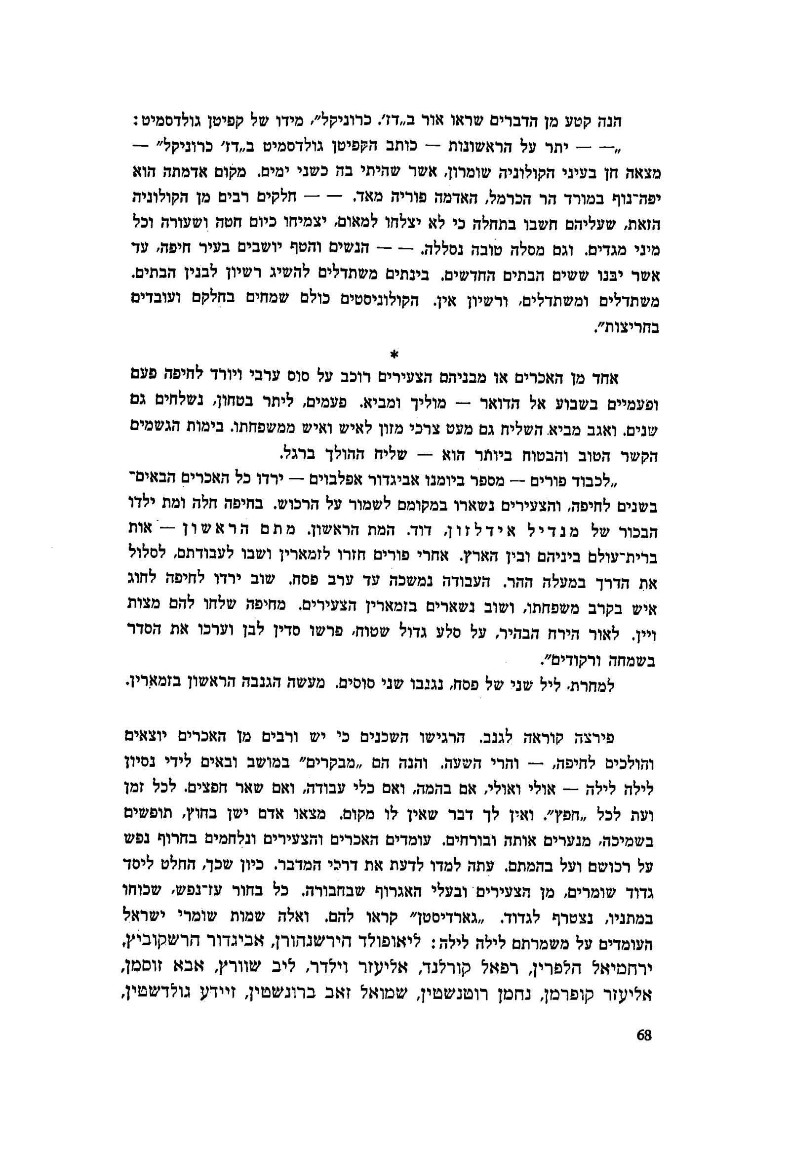פירצה קוראה לגנב. הרגישו השכנים כי יש ורבים מן האכרים יוצאים והולכים לחיפה, — והרי השעה. והנה הם ״מבקרים״ במושב ובאים לידי נסיון לילה לילה — אולי ואולי, אם בהמה, ואם כלי עבודה, ואם שאר חפצים. לכל זמן ועת לכל ״חפץ״. ואין לך דבר שאין לו מקום. מצאו אדם ישן בחוץ, תופשים בשמיכה, מנערים אותה ובורחים. עומדים האכרים והצעירים ונלחמים בחרוף נפש על רכושם ועל בהמתם. עתה למדו לדעת את דרכי המדבר. כיון שכך, החלט ליסד גדוד שומרים, מן הצעירים ובעלי האגרוף שבחבורה. כל בחור עז־נפש, שכוחו במתניו, נצטרף לגדוד. ״גארדיסטן״ קראו להם. ואלה שמות שומרי ישראל העומדים על משמרתם לילה לילה: