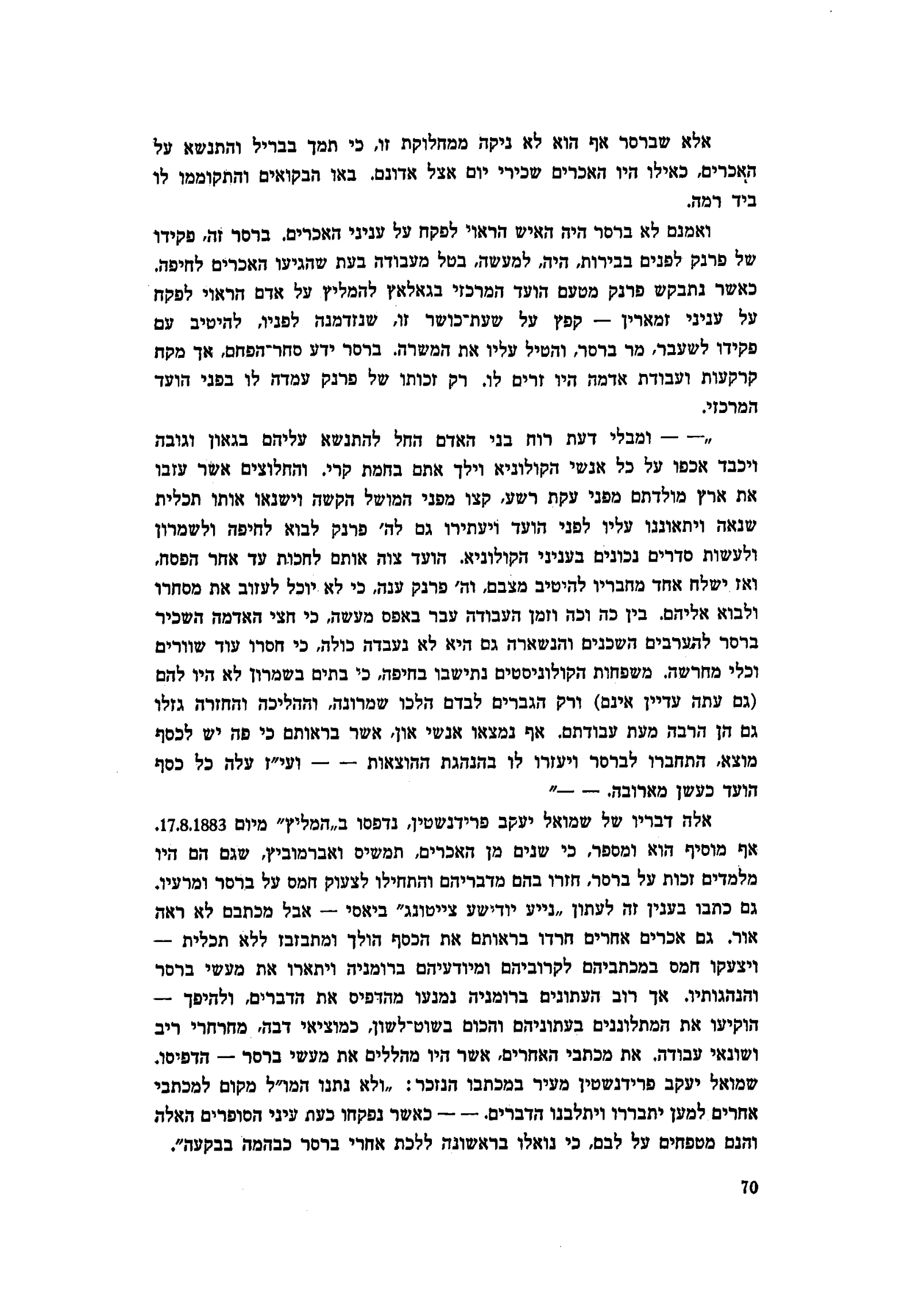 ״— — ומבלי דעת רוח בני האדם החל להתנשא עליהם בגאון וגובה ויכבד אכפו על כל אנשי הקולוניא וילך אתם בחמת קרי. והחלוצים אשר עזבו את ארץ מולדתם מפני עקת רשע, קצו מפני המושל הקשה וישנאו אותו תכלית שנאה ויתאוננו עליו לפני הועד ויעתירו גם לה׳ פרנק לבוא לחיפה ולשמרון ולעשות סדרים נכונים בעניני הקולוניא. הועד צוה אותם לחכות עד אחר הפסח, ואז ישלח אחד מחבריו להיטיב מצבם, וה׳ פרנק ענה, כי לא יוכל לעזוב את מסחרו ולבוא אליהם. בין כה וכה וזמן העבודה עבר באפס מעשה, כי חצי האדמה השכיר ברסר להערבים השכנים והנשארה גם היא לא נעבדה כולה, כי חסרו עוד שוורים וכלי מחרשה. משפחות הקולוניסטים נתישבו בחיפה, כי בתים בשמרון לא היו להם (גם עתה עדיין אינם) ורק הגברים לבדם הלכו שמרונה, וההליכה והחזרה גזלו גם הן הרבה מעת עבודתם. אף נמצאו אנשי און, אשר בראותם כי פה יש לכסף מוצא, התחברו לברסר ויעזרו לו בהנהגת ההוצאות — — ועי״ז עלה כל כסף הועד כעשן מארובה. — -״