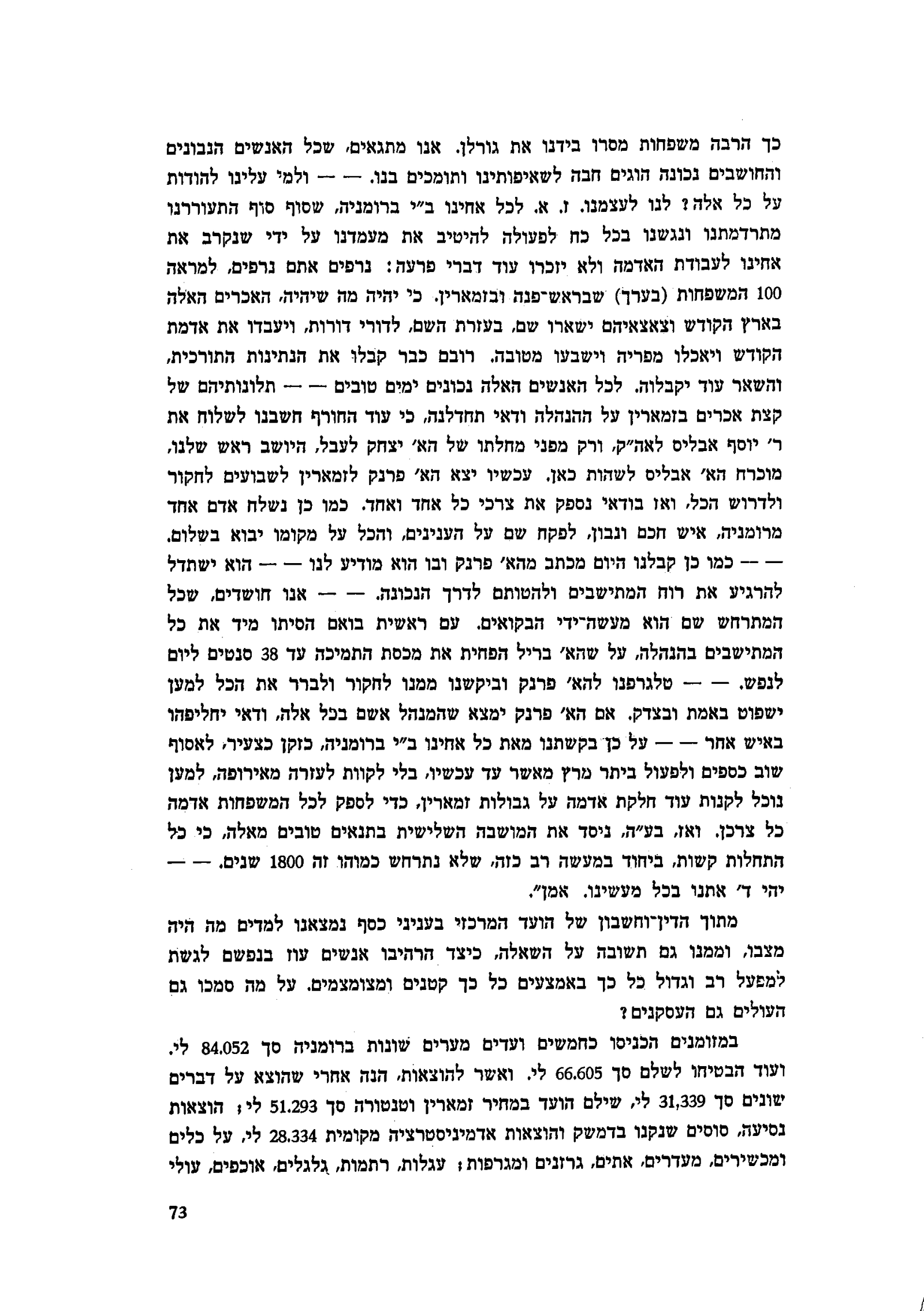 פרנק לזמארין לשבועיים לחקור ולדרוש הכל, ואז בודאי נספק את צרכי כל אחד ואחד. כמו כן נשלח אדם אחד מרומניה, איש חכם ונבון, לפקח שם על הענינים, והכל על מקומו יבוא בשלום. — — כמו כן קבלנו היום מכתב מהא׳ פרנק ובו הוא מודיע לנו -— הוא ישתדל להרגיע את רוח המתישבים ולהטותם לדרך הנכונה. — — אנו חושדים, שכל המתרחש שם הוא מעשה ידי הבקואים. עם ראשית בואם הסיתו מיד את כל המתיישבים בהנהלה, על שהא׳ בריל הפחית את מכסת התמיכה עד 38 סנטים ליום לנפש. — — טלגרפנו להא׳ פרנק וביקשנו ממנו לחקור ולברר את הכל למען ישפוט באמת ובצדק. אם
