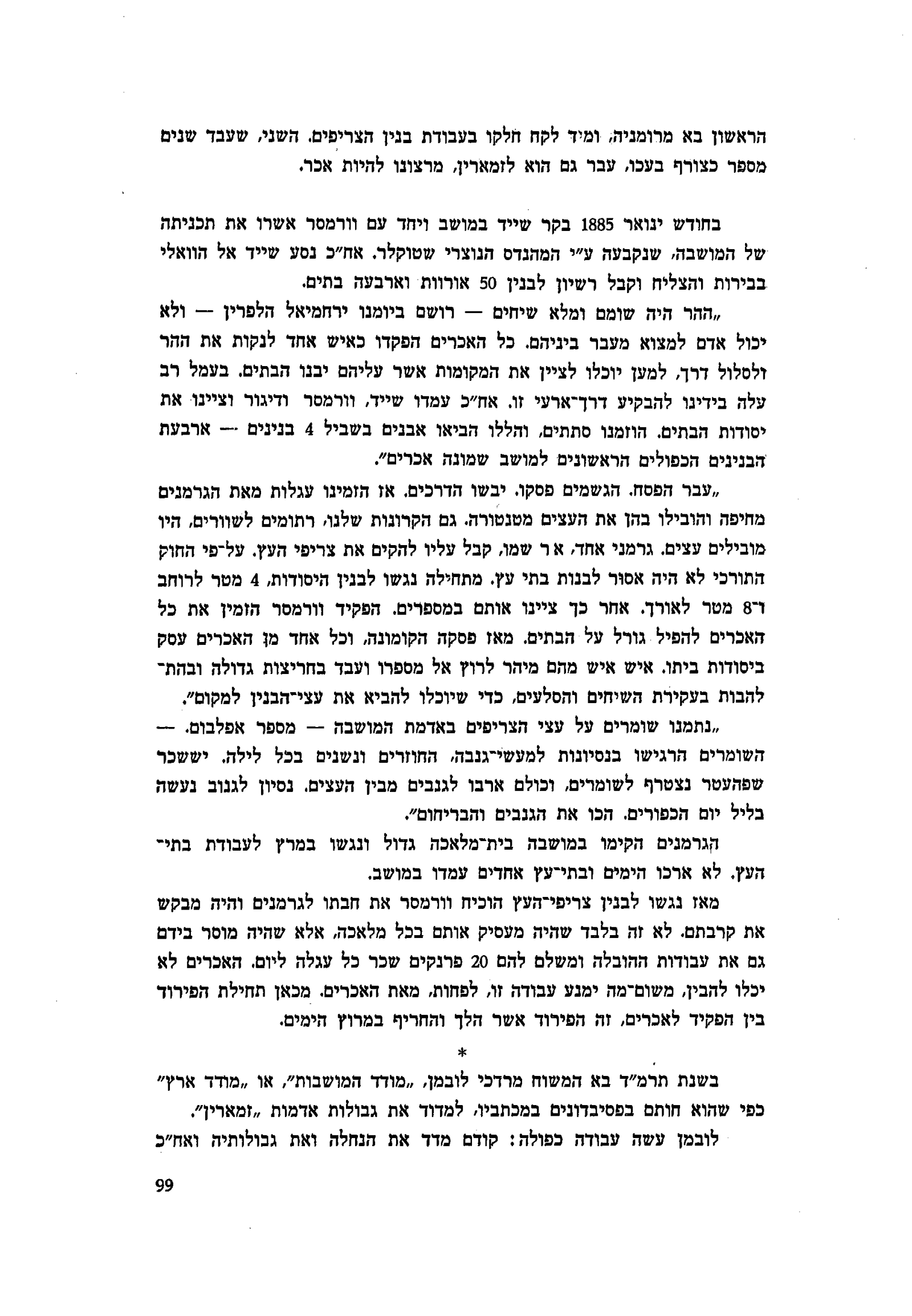 ״עבר הפסח. הגשמים פסקו. יבשו הדרכים. אז הזמינו עגלות מאת הגרמנים מחיפה והובילו בהן את העצים מטנטורה. גם הקרונות שלנו, רתומים לשוורים, היו מובילים עצים. גרמני אחד, אר שמו, קבל עליו להקים את צריפי העץ. על־פי החוק התורכי לא היה אסור לבנות בתי עץ. מתחילה נגשו לבניין היסודות, 4 מטר לרוחב ו-8 מטר לאורך. אחר כך ציינו אותם במספרים. הפקיד וורמסר הזמין את כל האכרים להפיל גורל על הבתים. מאז פסקה הקומונה, וכל אחד מן האכרים עסק ביסודות ביתו. איש איש מהם מיהר לרוץ אל מספרו ועבד בחריצות גדולה ובהתלהבות בעקירת השיחים והסלעים, כדי שיוכלו להביא את עצי הבנין למקום״.