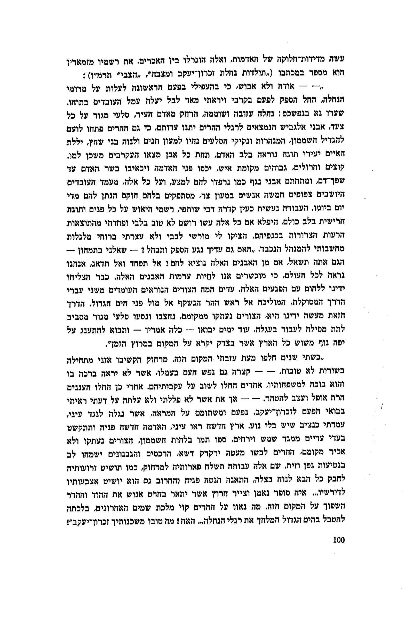״כשתי שנים חלפו מעת עזבתי המקום הזה. מרחוק הקשיבו אזני מתחילה בשורות לא טובות. - - קצרה גם נפש העם בעמלו, אשר לא יראה ברכה בו והוא בוכה למשפחותיו, אחדים החלו לשוב על עקבותיהם. אחרי כן החלו העננים הרת אופל ועצב להטהר. — — אך את אשר לא פללתי ולא עלתה על דעתי ראיתי בבואי הפעם לזכרון־יעקב. נפעם ומשתומם על המראה, אשר נגלה לנגד עיני, עמדתי כנציב שיש בלי נוע. ארץ חדשה ראו עיני, האדמה חדשה פניה ותתקשט בעדי עדיים ממגד שמש וירחים, ספו תמו בלהות השממון, הצורים נעתקו ולא אכיר מקומם, ההרים לבשו מעטה ירקרק דשא, הרכסים והגבנונים ישמחו לב בנטיעות גפן וזית. שם אלה עבותה תשלח פארותיה למרחוק, כמו תושיט זרועותיה לחבק כל הבא לנוח בצלה, התאנה חנטה פגיה והחרוב גם הוא יושיט אצבעותיו לדורשיו... איה סופר נאמן וצייר חרוץ אשר יתאר בחרט אנוש את ההוד וההדר השפוך על המקום הזה. מה נאוו על ההרים קוי מלכת שמים האחרונים, בלכתה להטבל בהים הגדול המלחך את רגלי הנחלה... האח! מה טובו משכנותיך זכרון יעקב״!