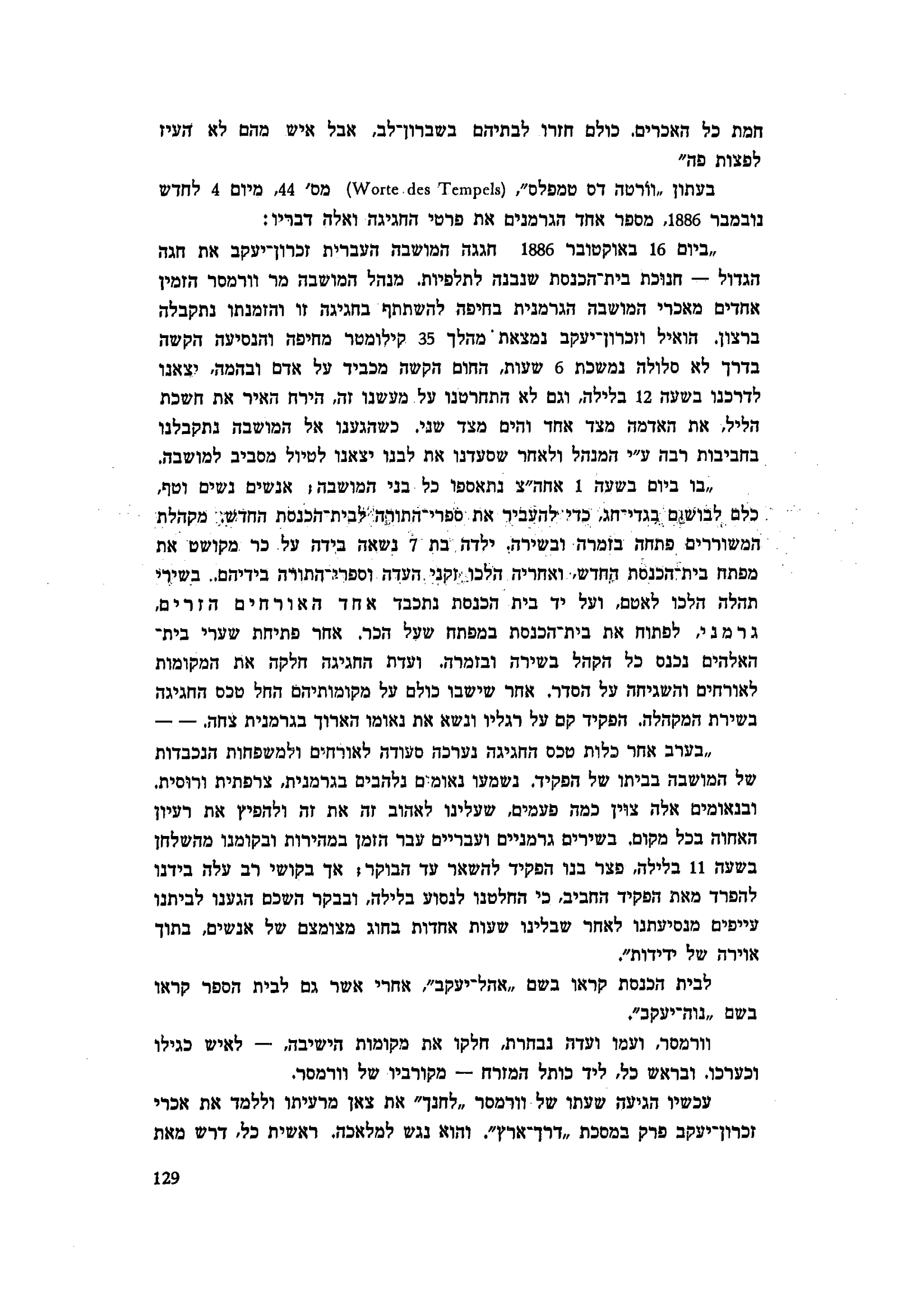 מס׳ 44, מיום 4 לחדש נובמבר 1886, מספר אחד הגרמנים את פרטי החגיגה ואלה דבריו: ״ביום 16 באוקטובר 1886 חגגה המושבה העברית זכרון־יעקב את חגה הגדול - - חנוכת בית הכנסת שנבנה לתלפיות. מנהל המושבה מר וורמסר הזמין אחדים מאכרי המושבה הגרמנית בחיפה להשתתף בחגיגה זו והזמנתו נתקבלה ברצון. הואיל וזכרון־יעקב נמצאת מהלך 35 קילומטר מחיפה והנסיעה הקשה בדרך לא סלולה נמשכת 6 שעות, החום הקשה מכביד על אדם ובהמה, יצאנו לדרכנו בשעה 12 בלילה, וגם לא התחרטנו על מעשנו זה, הירח האיר את חשכת הליל, את האדמה מצד אחד והים מצד שני. כשהגענו אל המושבה נתקבלנו בחביבות רבה ע״י המנהל ולאחר שסעדנו את לבנו יצאנו לטיול מסביב למושבה.