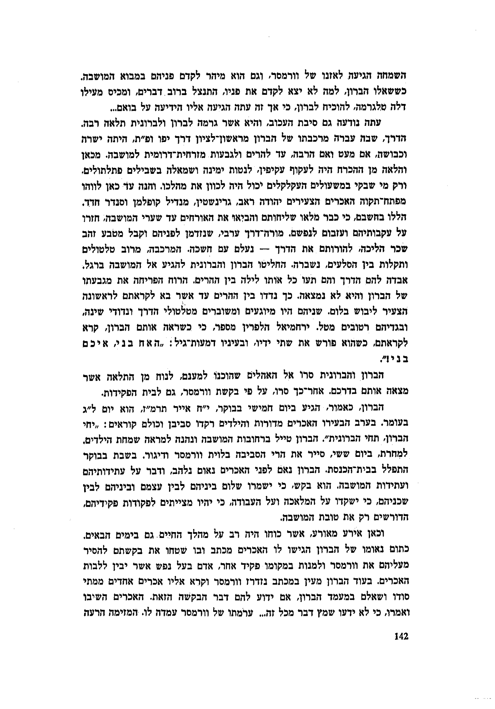 תרמ״ז 1887 , הוא יום ל״ג בעומר. בערב הבעירו האכרים מדורות והילדים רקדו סביבן וכולם קוראים: ״יחי הברון, תחי הברונית״. הברון טייל ברחובות המושבה ונהנה למראה שמחת הילדים. למחרת, ביום ששי, סייר את הרי הסביבה בלוית וורמסר ודיגור. בשבת בבוקר התפלל בבית הכנסת. הברון נאם לפני האכרים נאום נלהב, ודבר על עתידותיהם ועתידות המושבה. הוא בקש, כי ישמרו שלום ביניהם לבין עצמם וביניהם לבין שכניהם, כי ישקדו על המלאכה ועל העבודה, כי יהיו מצייתים לפקודות פקידיהם הדורשים רק את טובת המושבה.