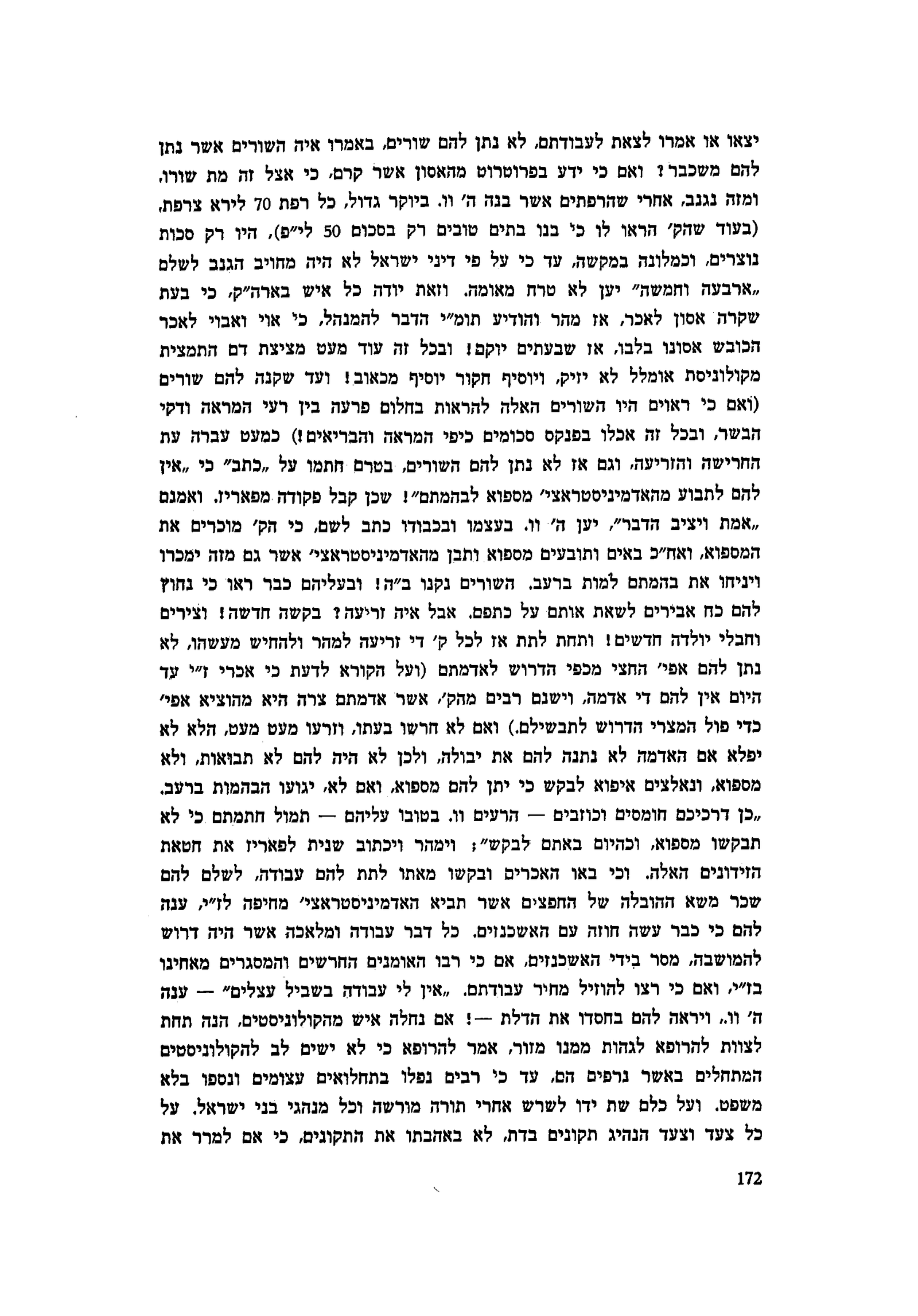 וו. ביוקר גדול, כל רפת 70 לירא צרפת (בעוד שהק׳ הראו לו כי בנו בתים טובים רק בסכום 50 לי״פ), היו רק סכות נוצרים, וכמלונה במקשה, עד כי על פי דיני ישראל לא היה מחויב הגנב לשלם ״ארבעה וחמשה״ יען לא טרח מאומה. וזאת יודה כל איש בארה״ק, כי בעת שקרה אסון לאכר, אז מהר והודיע