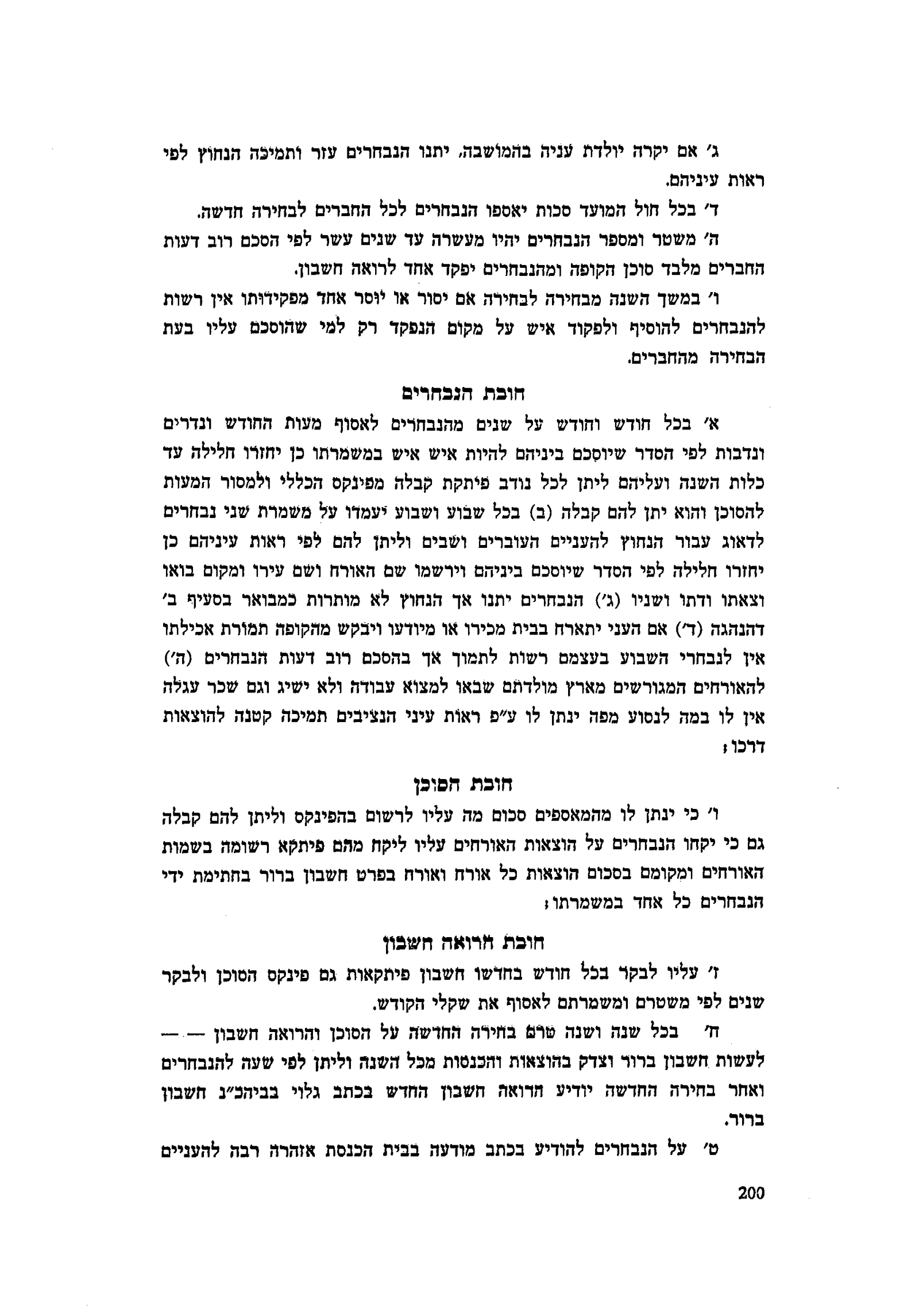 משטר ומספר הנבחרים יהיו מעשרה עד שנים עשר לפי הסכם רוב דעות החברים מלבד סוכן הקופה ומהנבחרים יפקד אחד לרואה חשבון.