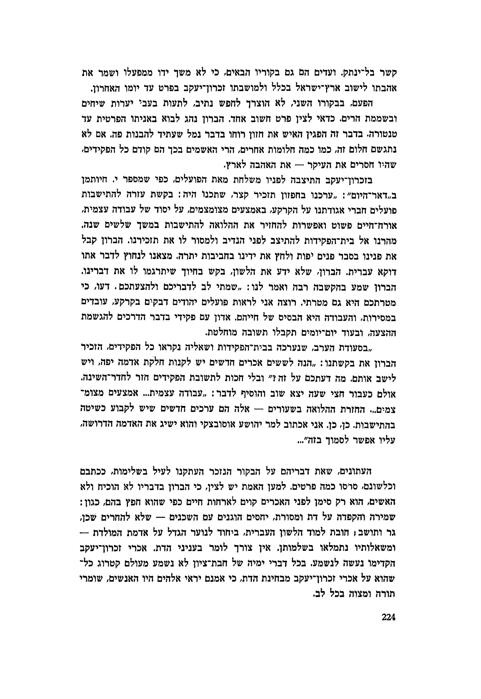 ״בסעודת הערב, שנערכה בבית־הפקידות ושאליה נקראו כל הפקידים, הזכיר הברון את בקשתנו: ״הנה לששים אכרים חדשים יש לקנות חלקת אדמה יפה, ויש לישב אותם. מה דעתכם על זה?״ ובלי חכות לתשובת הפקידים חזר לחדר־השינה. אולם כעבור חצי שעה יצא שוב והוסיף לדבר: ״עבודה עצמית... אמצעים מצומצמים... החזרת ההלואה בשעורים — אלה הם ערכים חדשים שיש לקבוע כשיטה בהתישבות. כן, כן. אני אכתוב למר יהושע אוסובצקי והוא ישיג את האדמה הדרושה, עליו אפשר לסמוך בזה״...