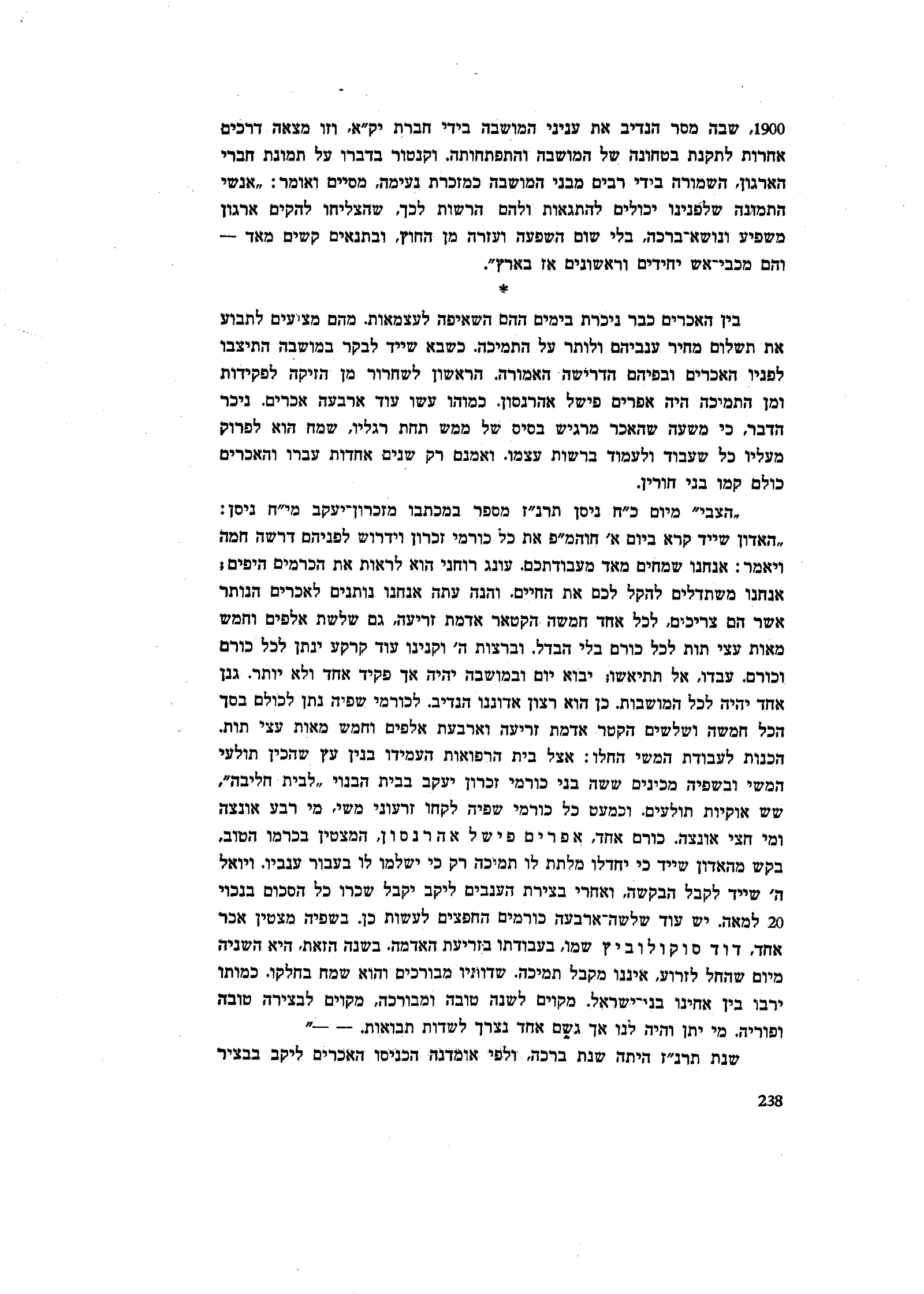 שמו, בעבודתו בזריעת האדמה. בשנה הזאת, היא השניה מיום שהחל לזרוע, איננו מקבל תמיכה. שדותיו מבורכים והוא שמח בחלקו. כמותו ירבו בין אחינו בני־ישראל. מקוים לשנה טובה ומבורכה, מקוים לבצירה טובה ופוריה. מי יתן והיה לנו אך גשם אחד נצרך לשדות תבואות. - -״