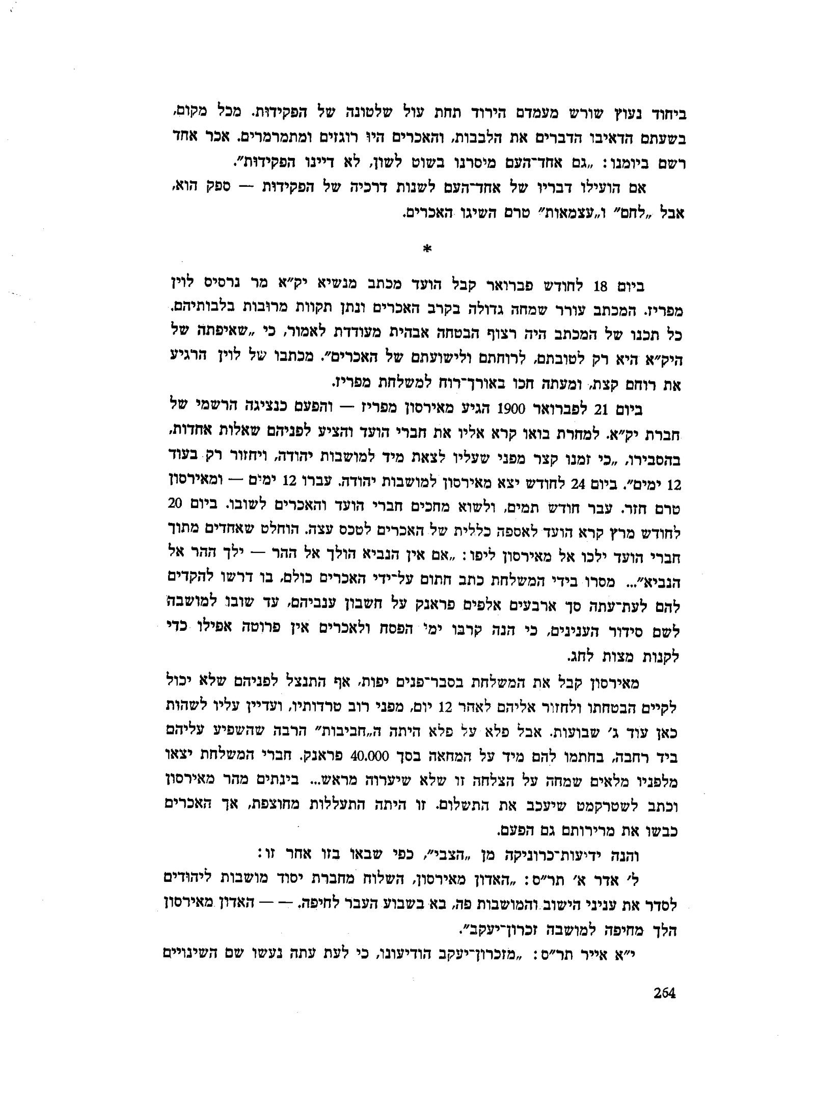 מר נרסיס לוין מפריז. המכתב עורר שמחה גדולה בקרב האכרים ונתן תקוות מרובות בלבותיהם. כל תכנו של המכתב היה רצוף הבטחה אבהית מעודדת לאמור, כי ״שאיפתה של היק״א היא רק לטובתם, לרוחתם ולישועתם של האכרים״. מכתבו של לוין הרגיע את רוחם קצת, ומעתה חכו באורך־רוח למשלחת מפריז.