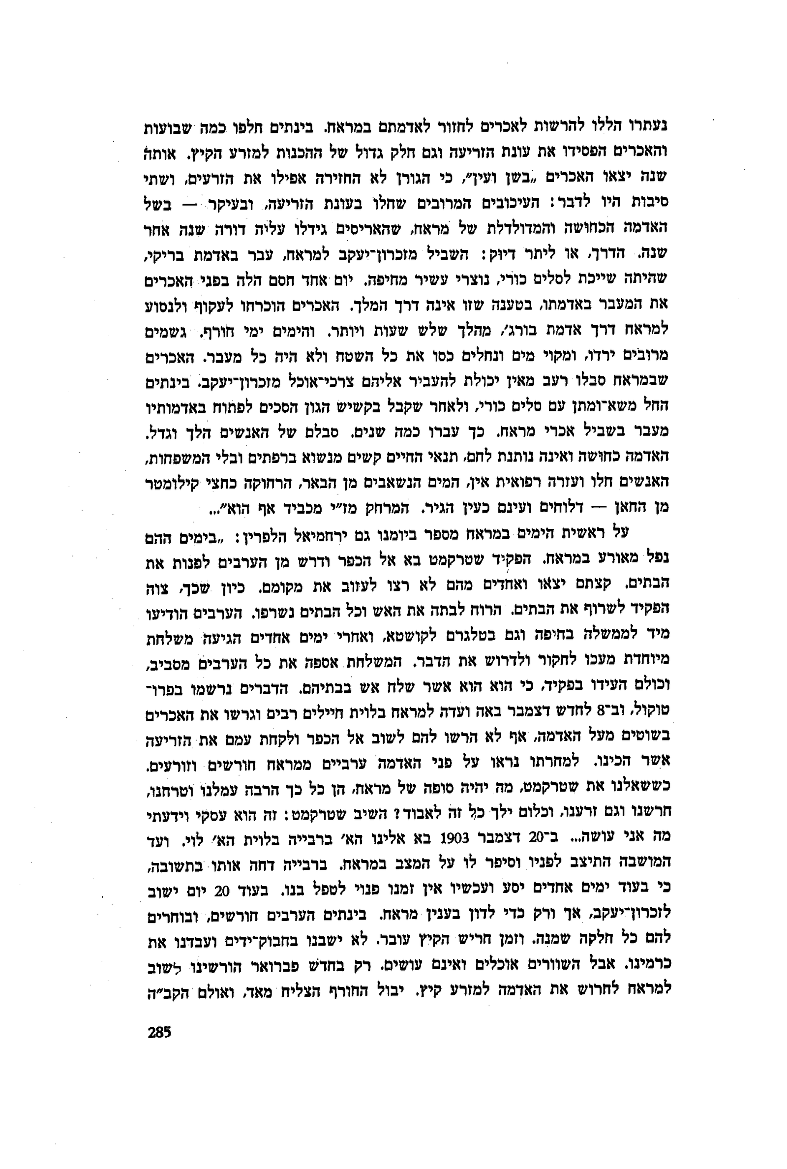 לוי. ועד המושבה התיצב לפניו וסיפר לו על המצב במראח. ברבייה דחה אותו בתשובה, כי בעוד ימים אחדים יסע ועכשיו אין זמנו פנוי לטפל בנו. בעוד 20 יום ישוב לזכרון־יעקב, אך ורק כדי לדון בענין מראח. בינתים הערבים חורשים, ובוחרים להם כל חלקה שמנה. וזמן חריש הקיץ עובר. לא ישבנו בחבוק־ידים ועבדנו את כרמינו. אבל השוורים אוכלים ואינם עושים. רק בחדש פברואר הורשינו לשוב למראח לחרוש את האדמה למזרע קיץ. יבול החורף הצליח מאד, ואולם הקב״ה