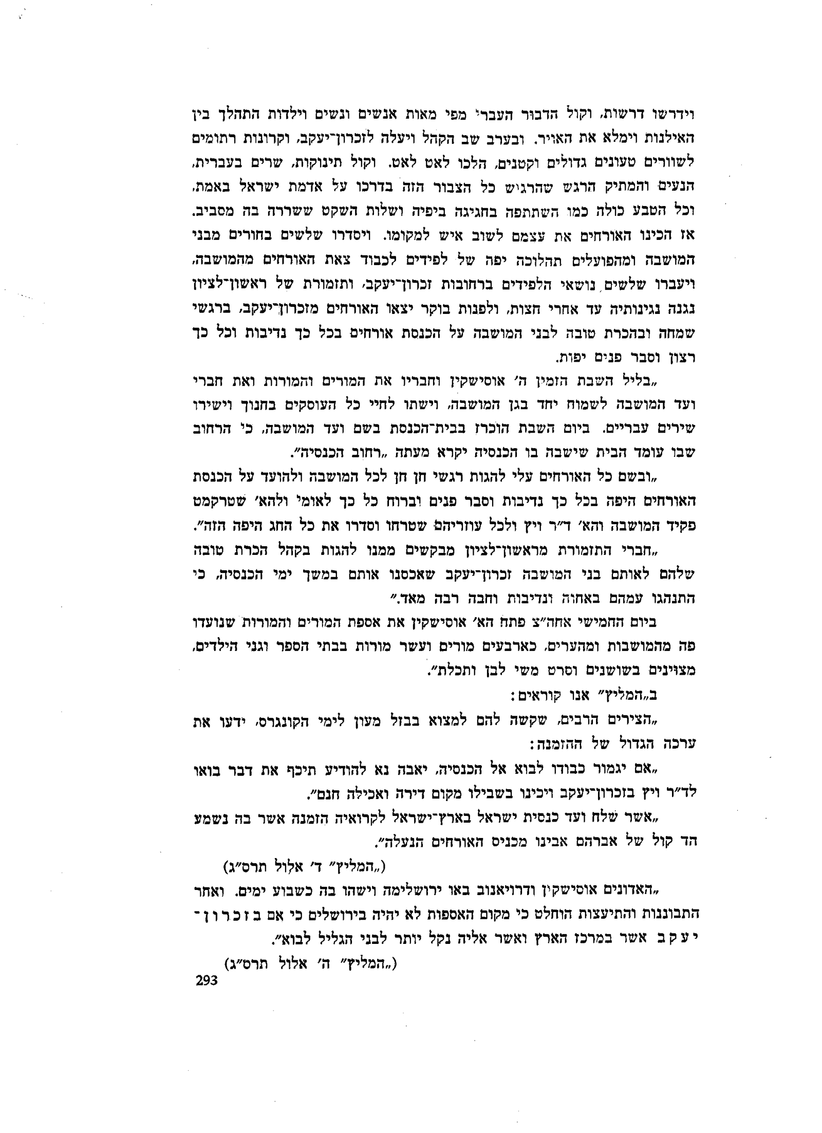 וידרשו דרשות, וקול הדבור העברי מפי מאות אנשים ונשים וילדות התהלך בין האילנות וימלא את האויר, ובערב שב הקהל ויעלה לזכרון־יעקב, וקרונות רתומים לשוורים טעונים גדולים וקטנים, הלכו לאט לאט. וקול תינוקות, שרים בעברית, הנעים והמתיק הרגש שהרגיש כל הצבור הזה בדרכו על אדמת ישראל באמת, וכל הטבע כולה כמו השתתפה בחגיגה ביפיה ושלות השקט ששררה בה מסביב. אז הכינו האורחים את עצמם לשוב איש למקומו. ויסדרו שלשים בחורים מבני המושבה ומהפועלים תהלוכה יפה של לפידים לכבוד צאת האורחים מהמושבה ויעברו שלשים נושאי הלפידים ברחובות זכרון־יעקב, ותזמורת של ראשון־לציון נגנה נגינותיה עד אחרי חצות, ולפנות בוקר יצאו האורחים מזכרון־יעקב, ברגשי שמחה ובהכרת טובה לבני המושבה על הכנסת אורחים בכל כך נדיבות וכל כך רצון וסבר פנים יפות.